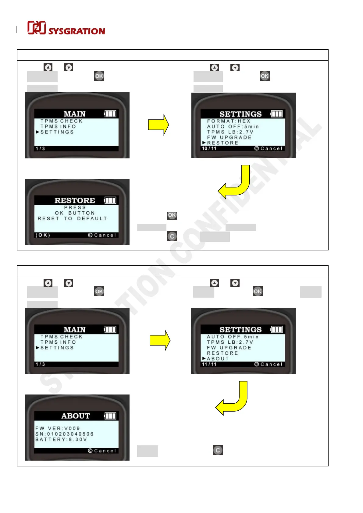“RESTORE” screen and back to “SETTINGS” screen automatically.