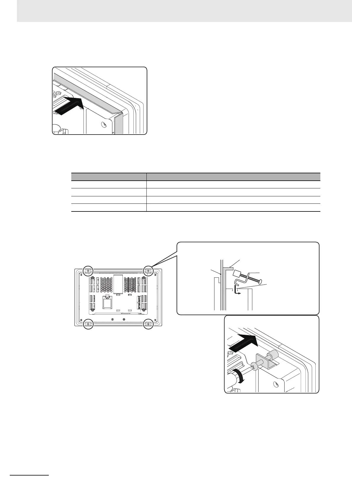 3 Attach the panel mounting brackets from the back of the panel as shown in the following figure.