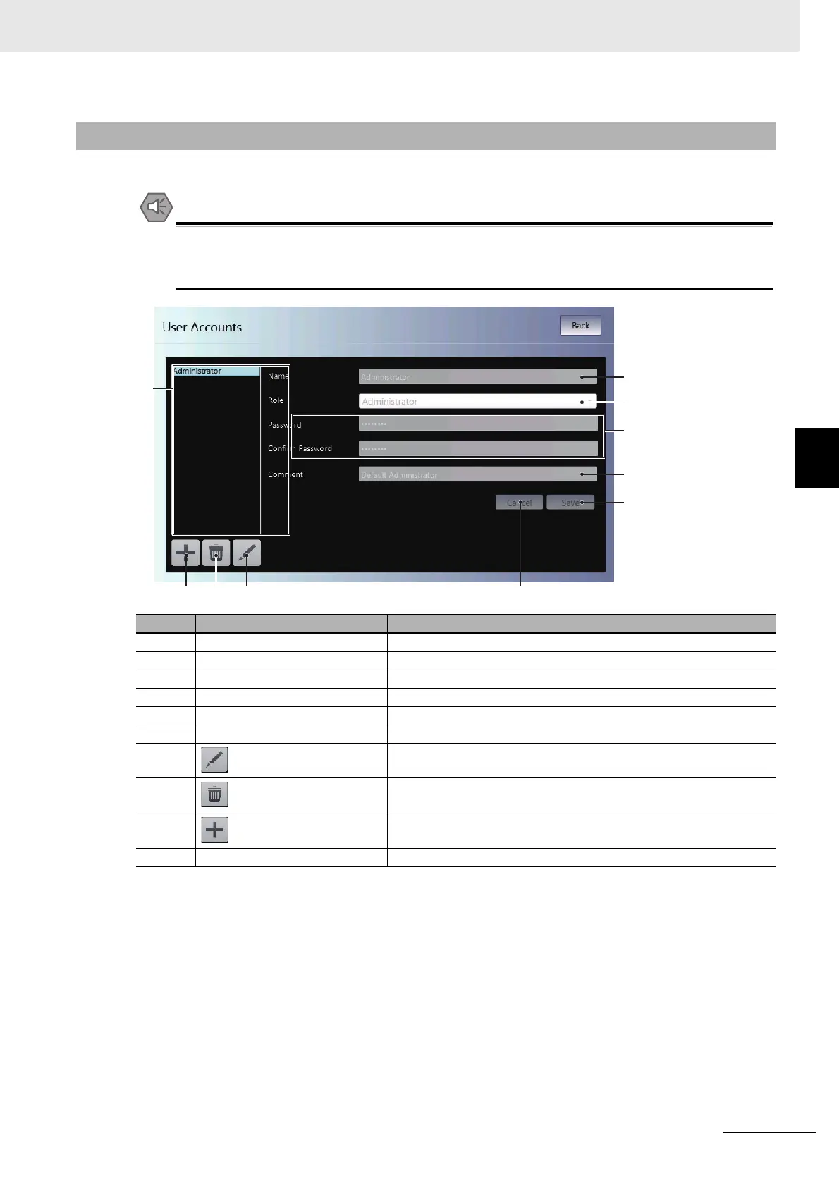 (j) User account table A list of the user accounts that are currently registered is displayed.