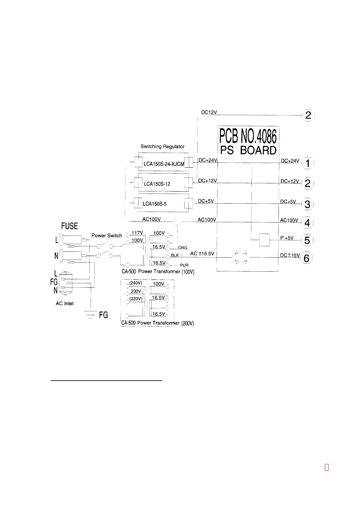 CA-500 Power Supply System is composed of the Power Transformer, Switching Regulators and PCB No.
