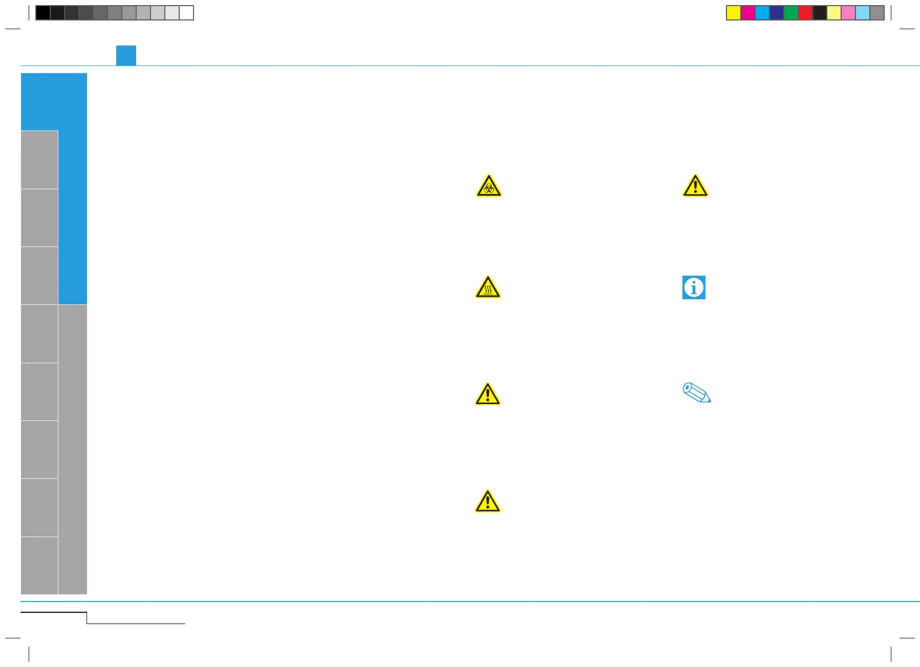 Symbols to indicate biological risks, warnings and helpful information are presen-
