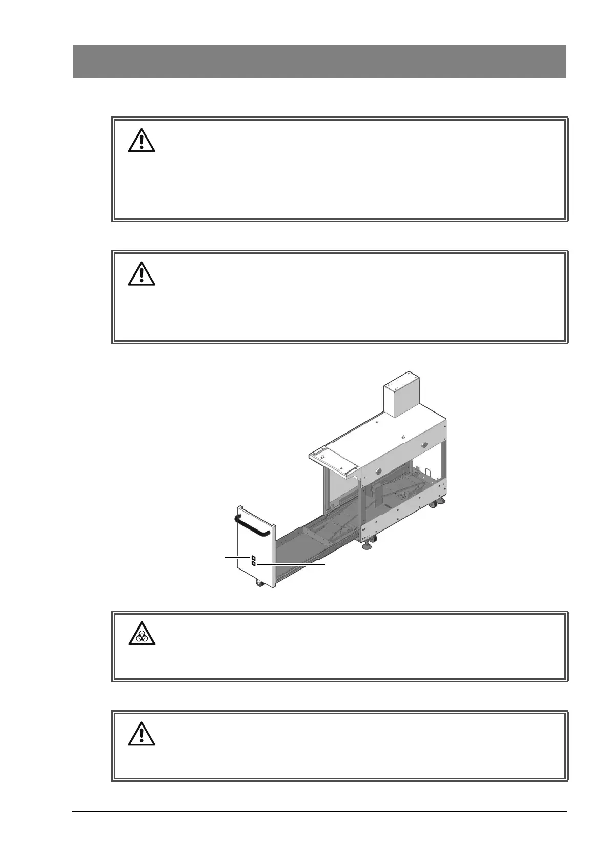 • Do not insert your hand or other object into the rack feed-out arm while it is in operation.