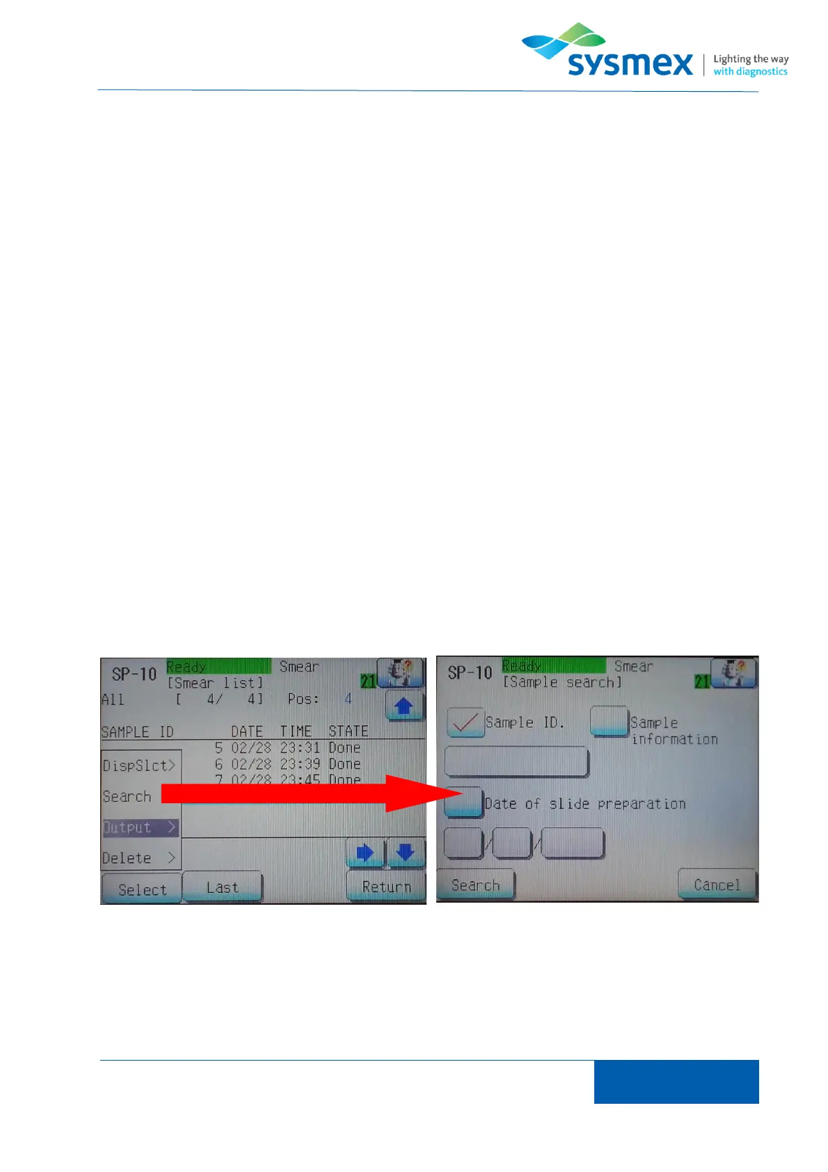 using sample ID, sample info or date of slide preparation. Press [Search] to locate sample within
