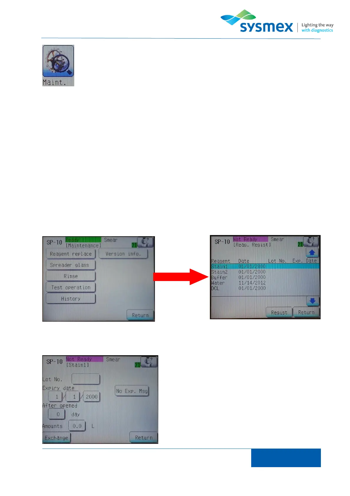 From the main menu press [Maint.] and select [Reagent replace] to open the reagent register