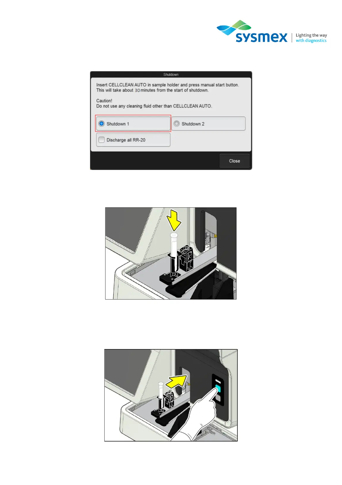 2. The Shutdown dialog box appears and the manual tube holder extends. Select [Shutdown 1].
