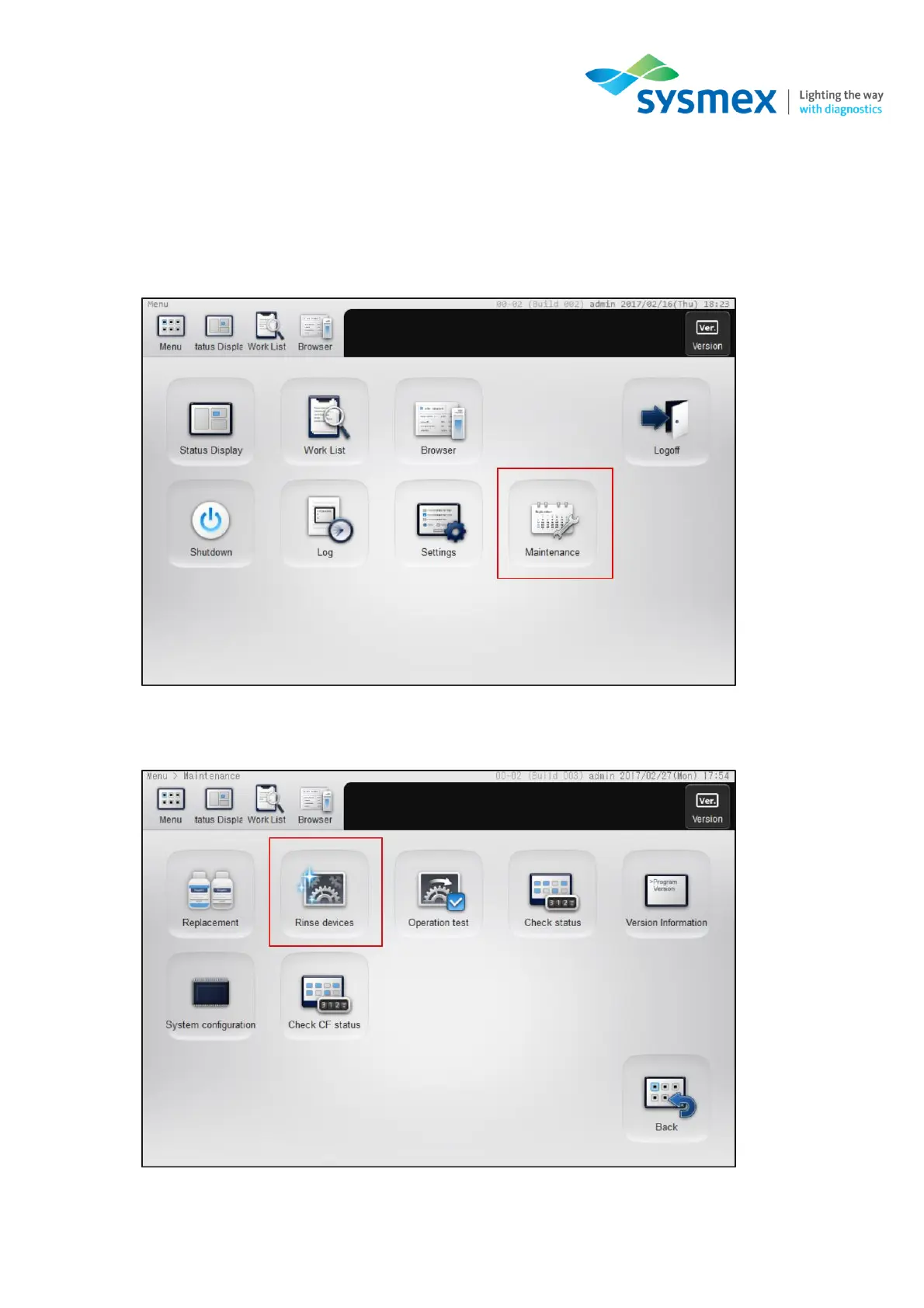 2. From the [Maintenance] menu select [Rinse devices] the [Cleaning].