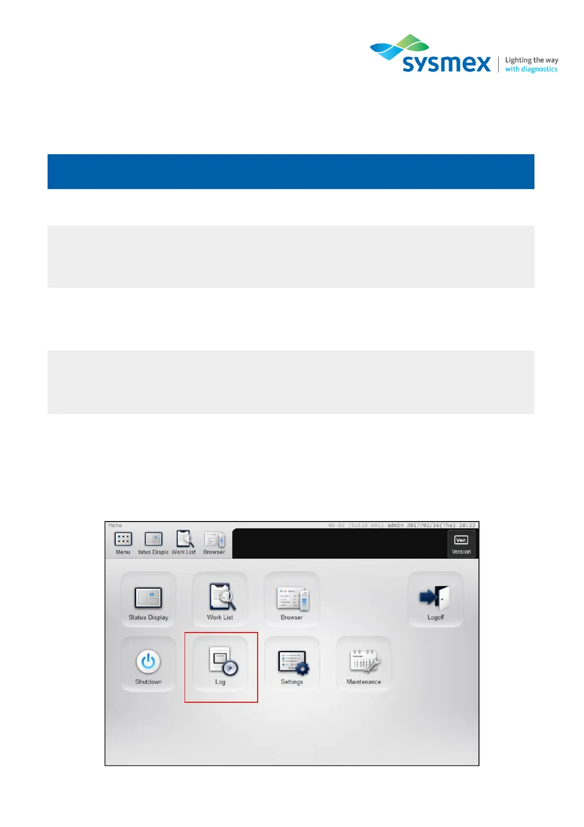 1. From the [Menu] screen select [Log].