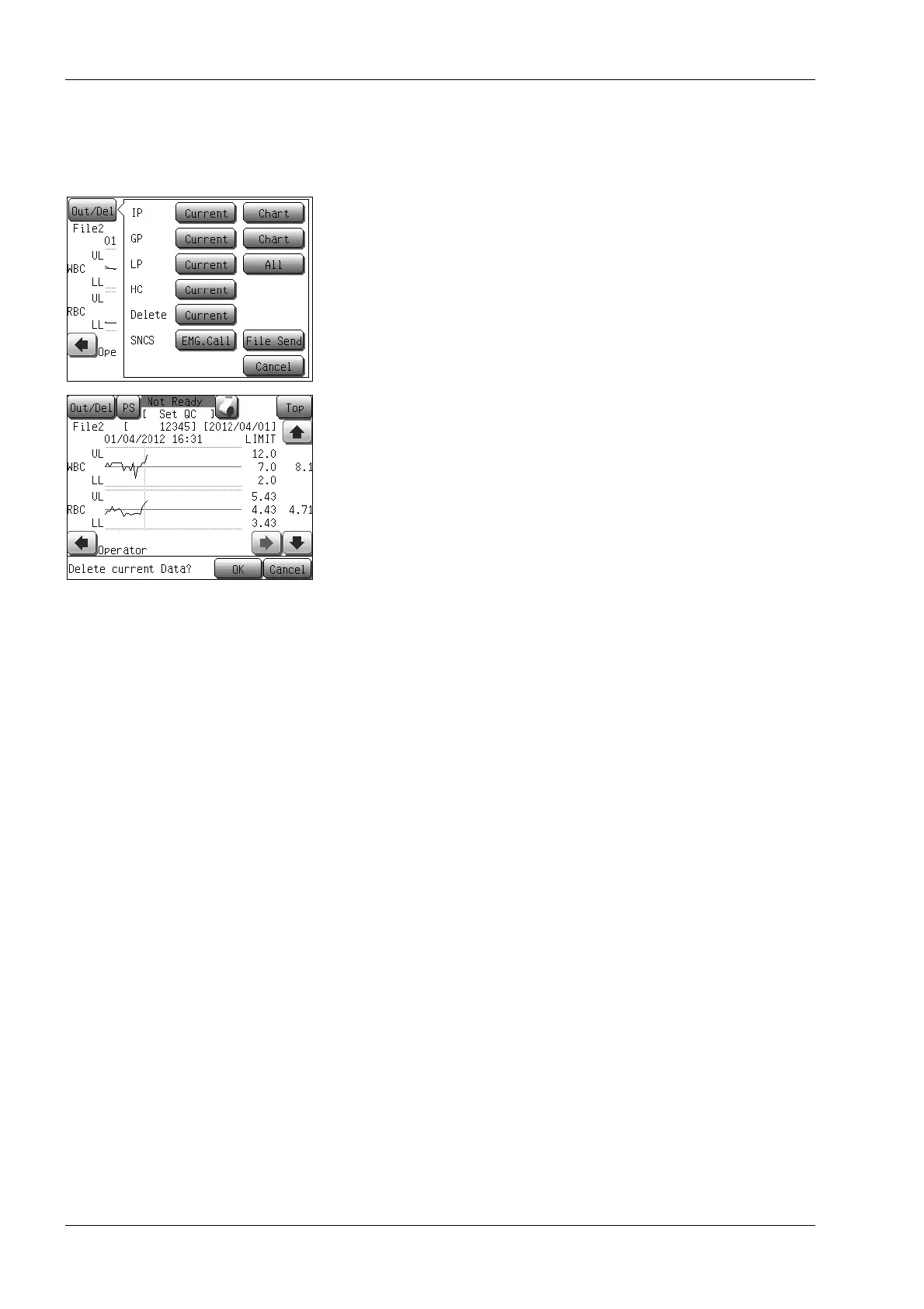 (1) Press the [Out/Del] button in the quality control chart screen.
