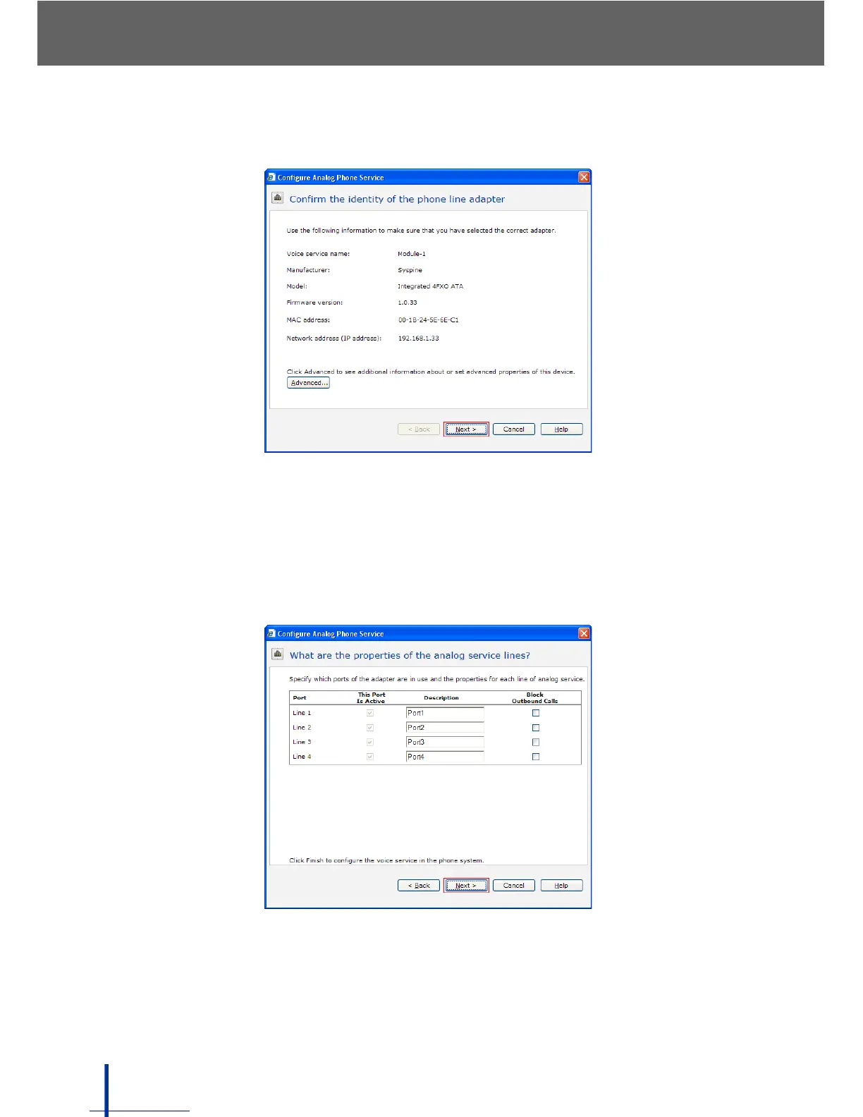 The Confirm the identity of the phone line adapter screen displays.