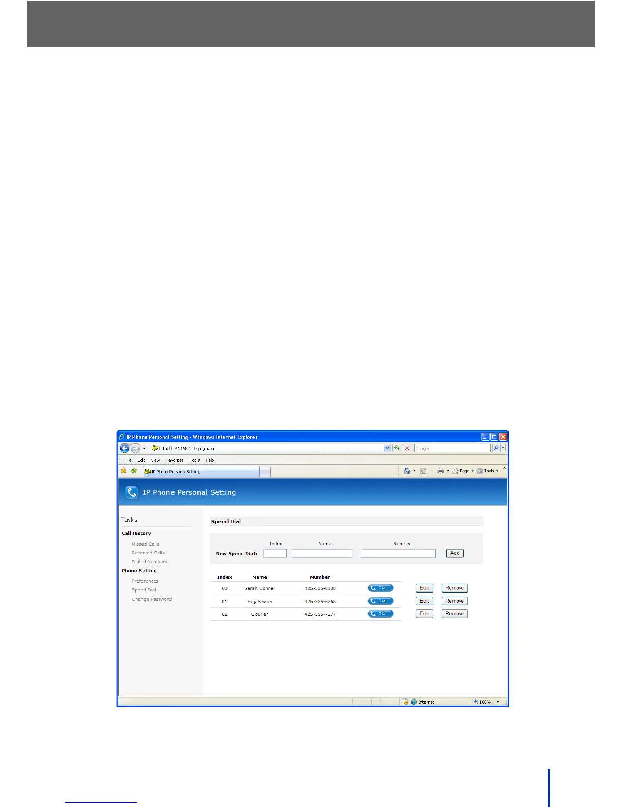 Click Speed Dial to view and manage up to 50 speed dial entries (0 to 49). The