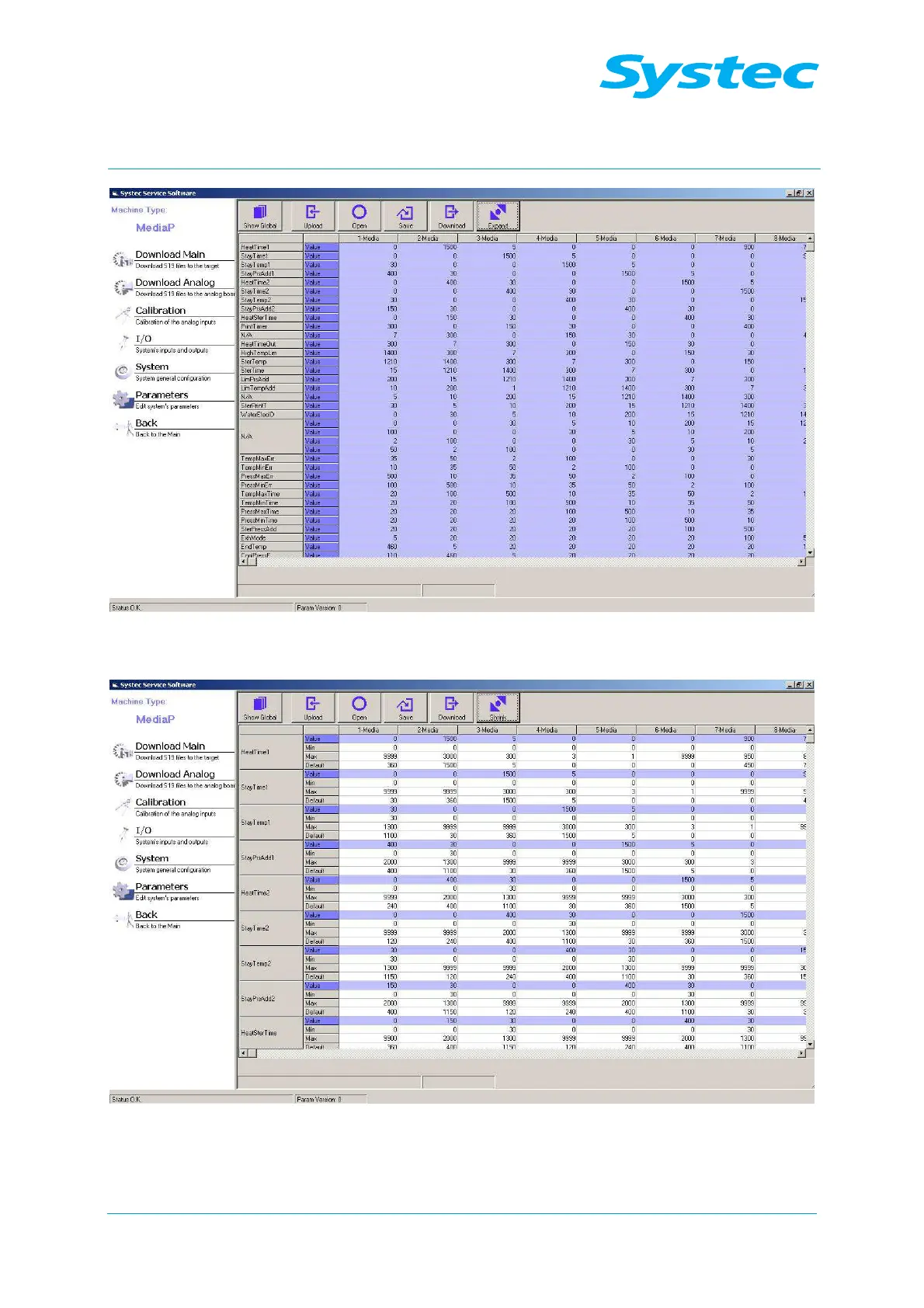 Systec DB-23 - Fig. 22: Systec Service Software: Parameters, Cycle View (Short Display); Fig. 23: Systec Service Software: Parameters, Cycle View (Long Display)