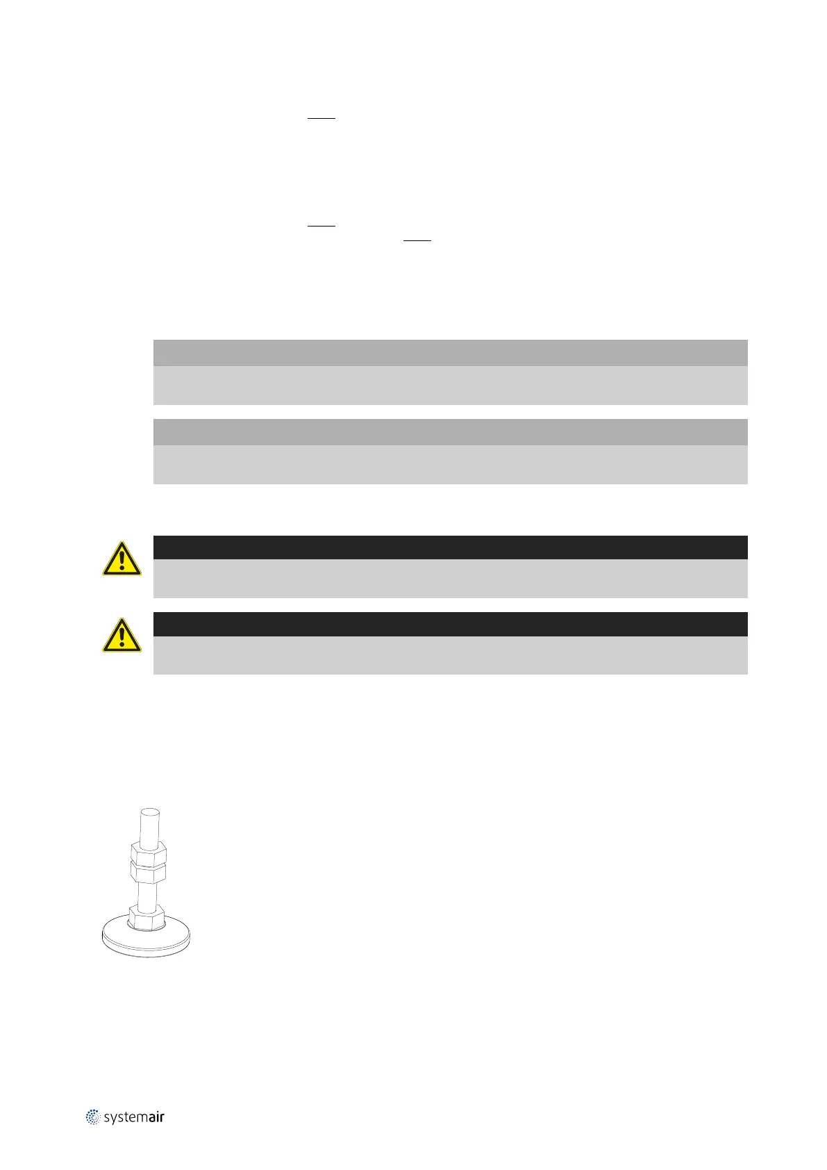 Mount adjustable feet with a distance of maximum 1500 mm between each foot under the base frame. The base frame