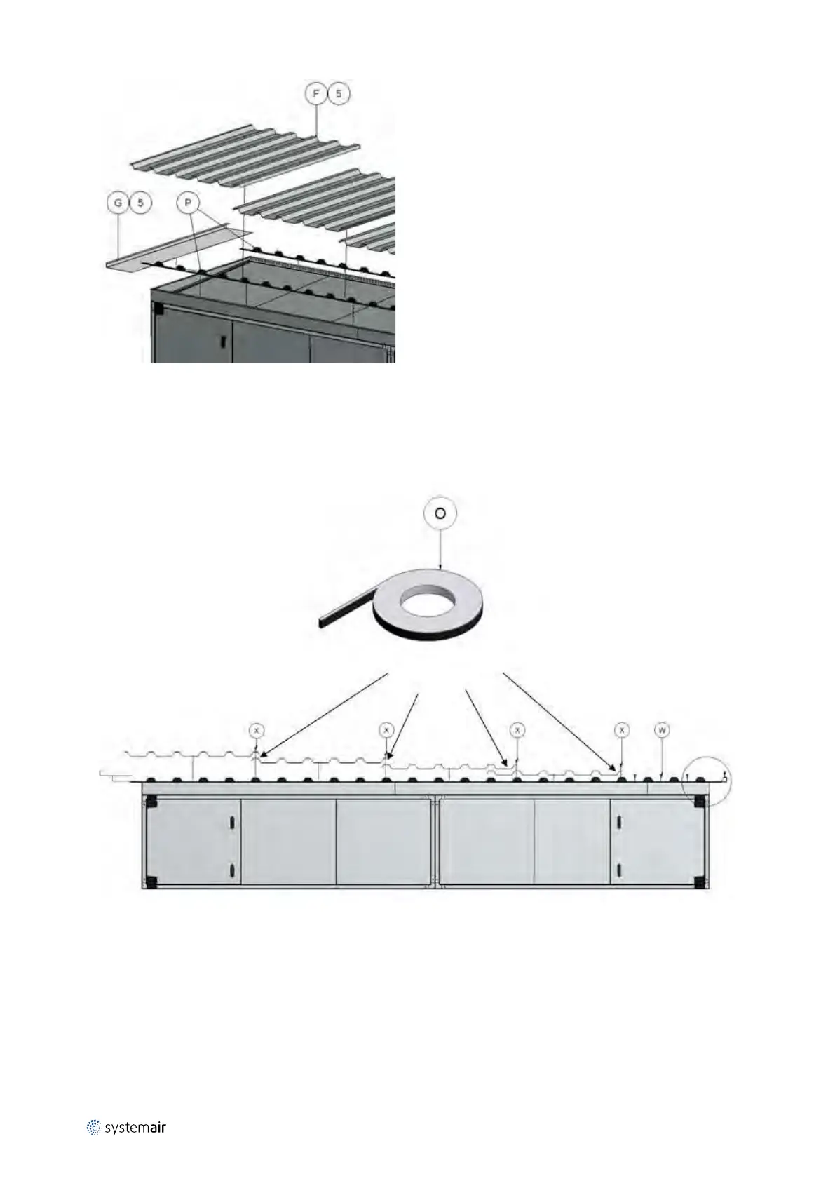 When the last trapezoidal plate (in this example F5) has been placed on the unit, the second roof overhang profile G5