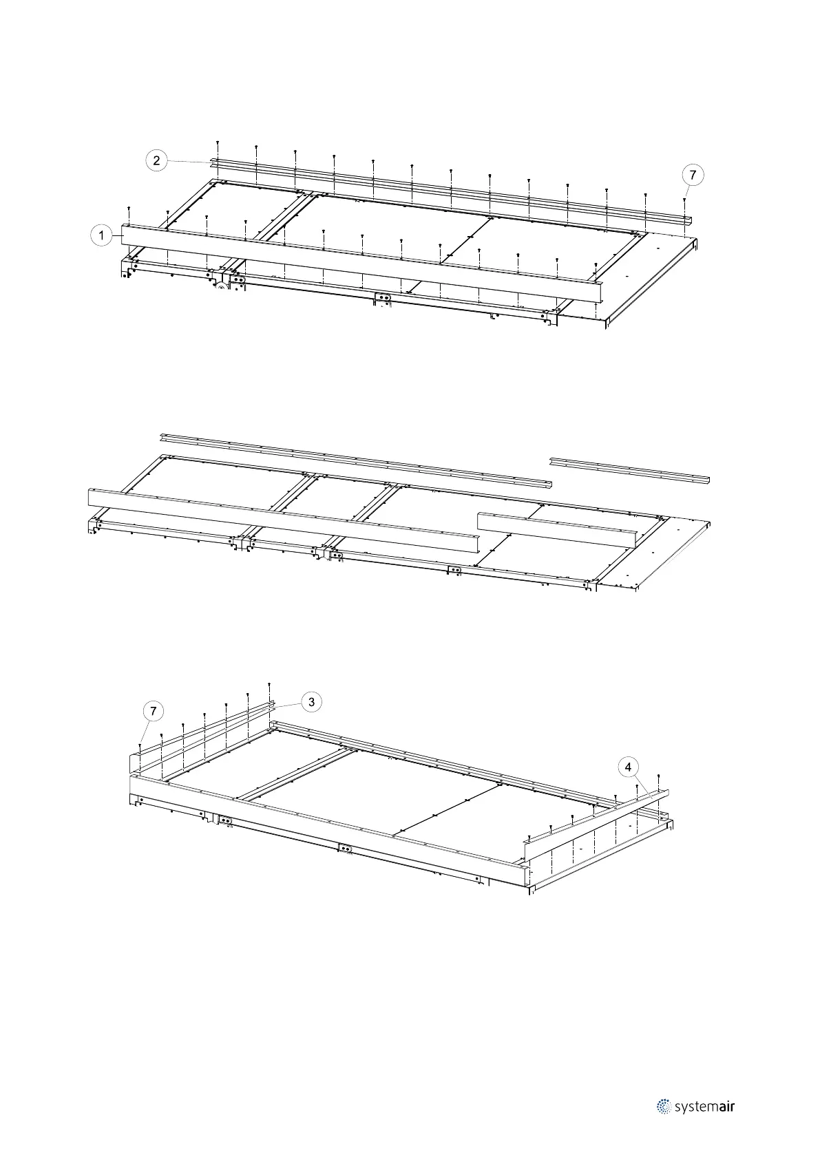 1. Mount front rail (pos 1) on the front side with inspection doors and back rail (pos 2) on the back of the unit. Use