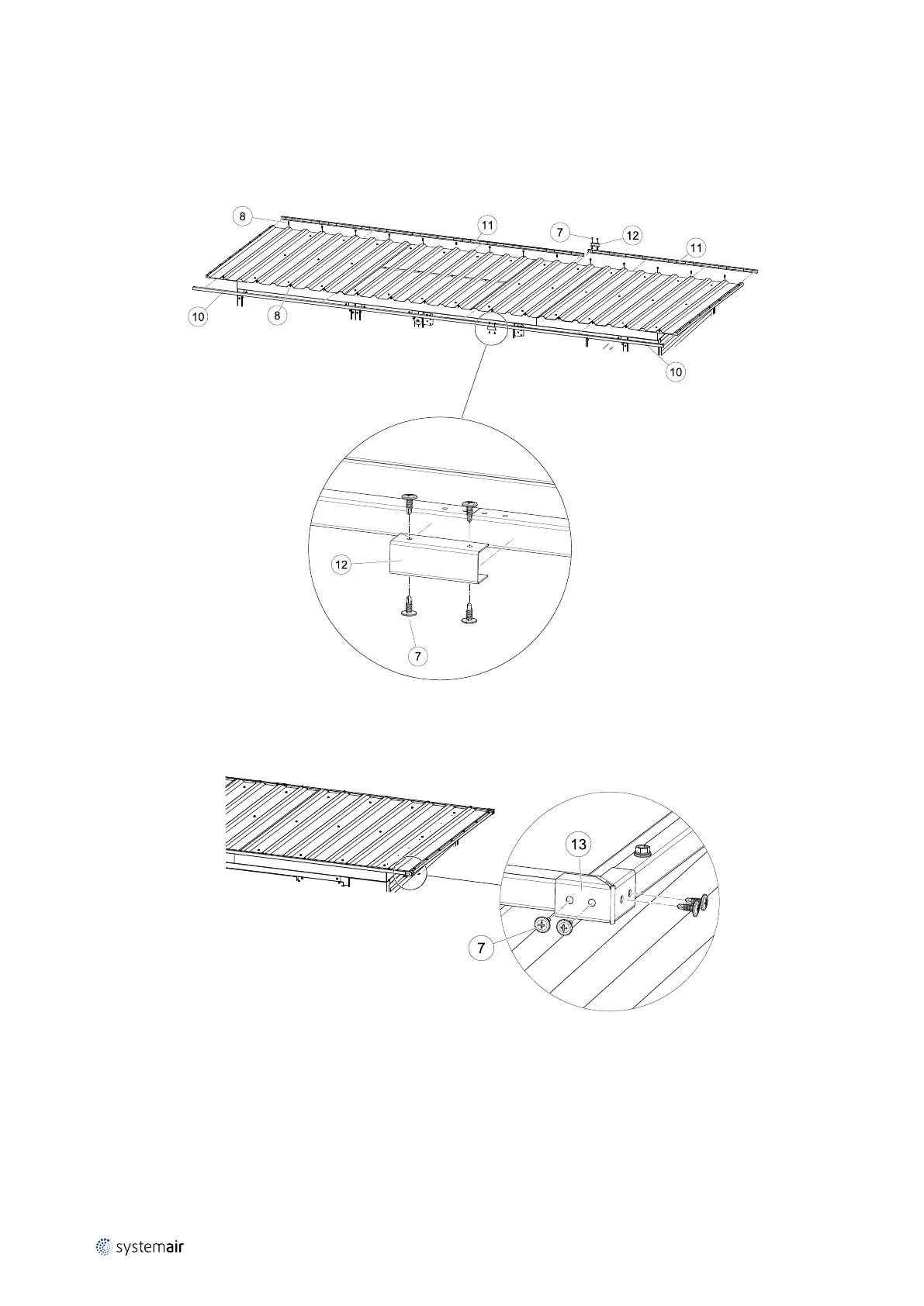 parts together with roof profile connectors (pos 12). Use self drilling screws (pos 7).