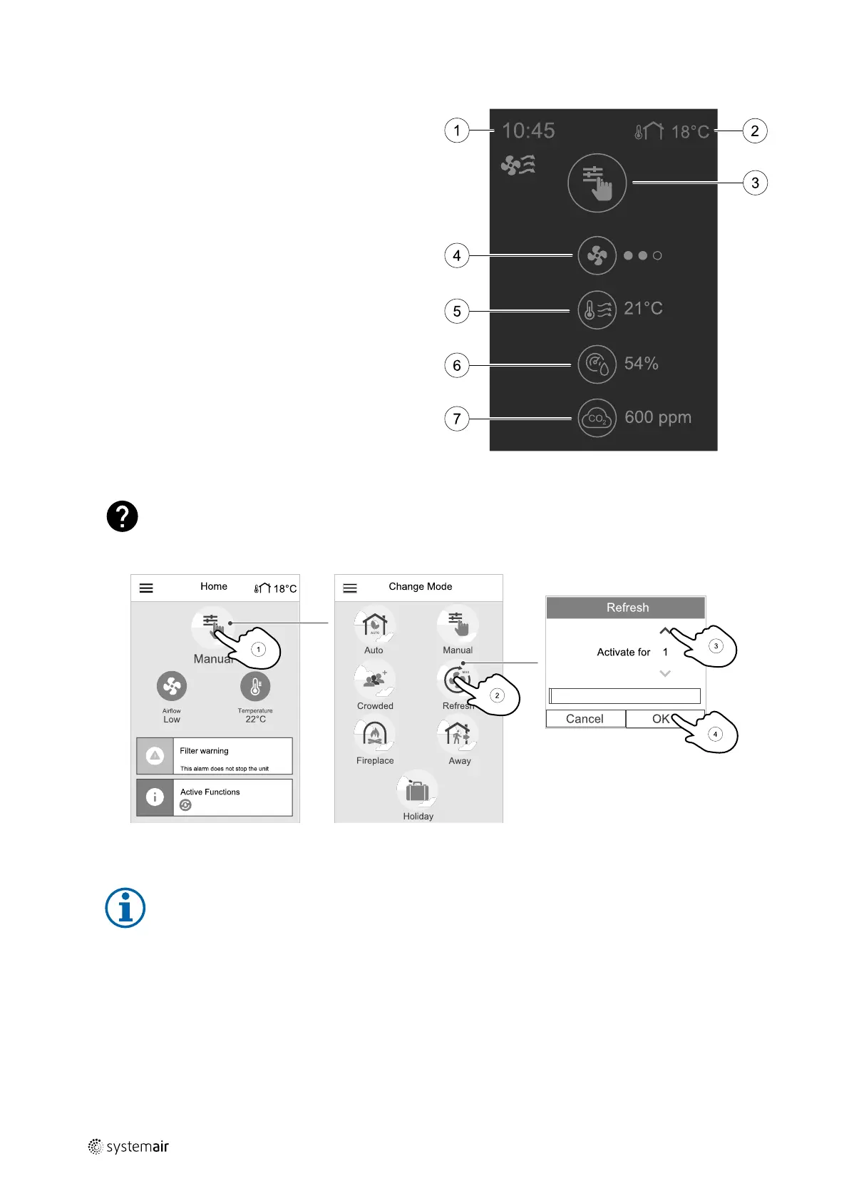 The top circle on the home screen indicates a currently active user mode. Touch the symbol to change the mode.