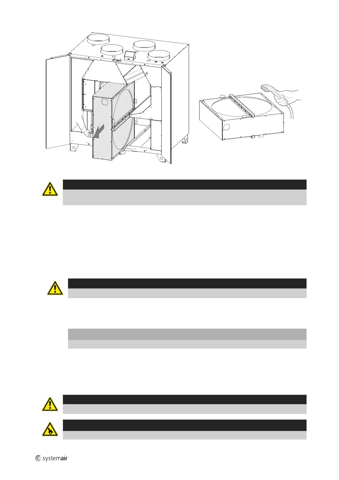 Risk för personskada! Värmeväxlaren väger cirka 25 kg. Värmeväxlaren kan falla ut ur aggregatet.