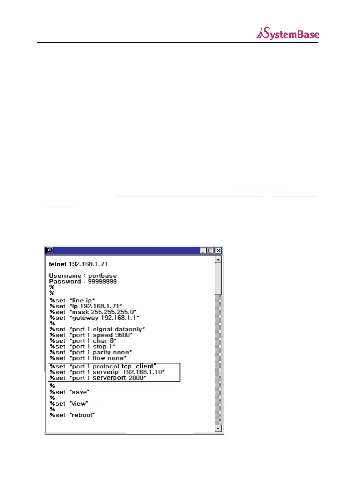 The following example describes configuration using a telnet connection. The first serial port of Portbase