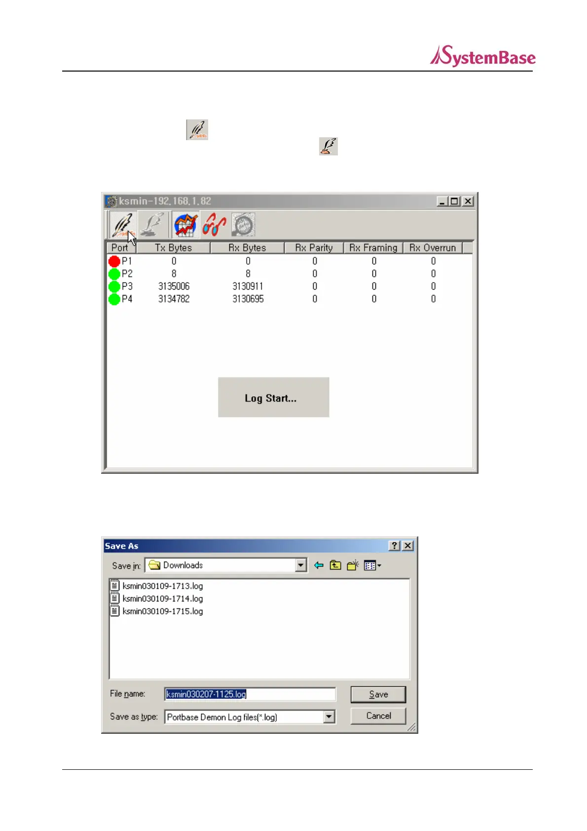 window, click on to display the log start message. The port operation status is recorded
