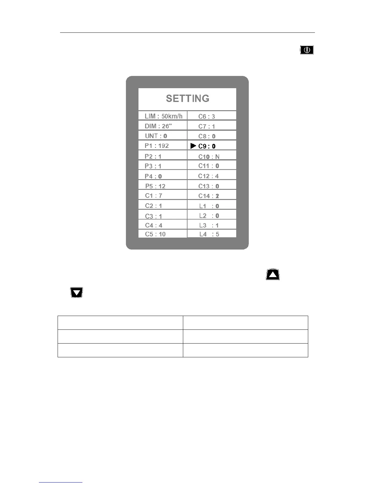 C9 is meter power-on password setting, the default value is 0, press button (UP)