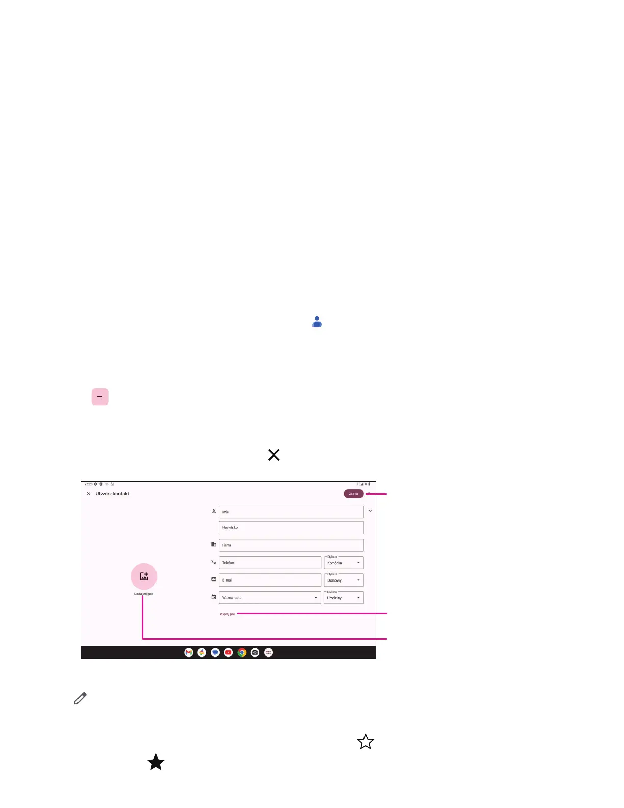 • Dotknij na liście kontaktów, aby utworzyć nowy kontakt.