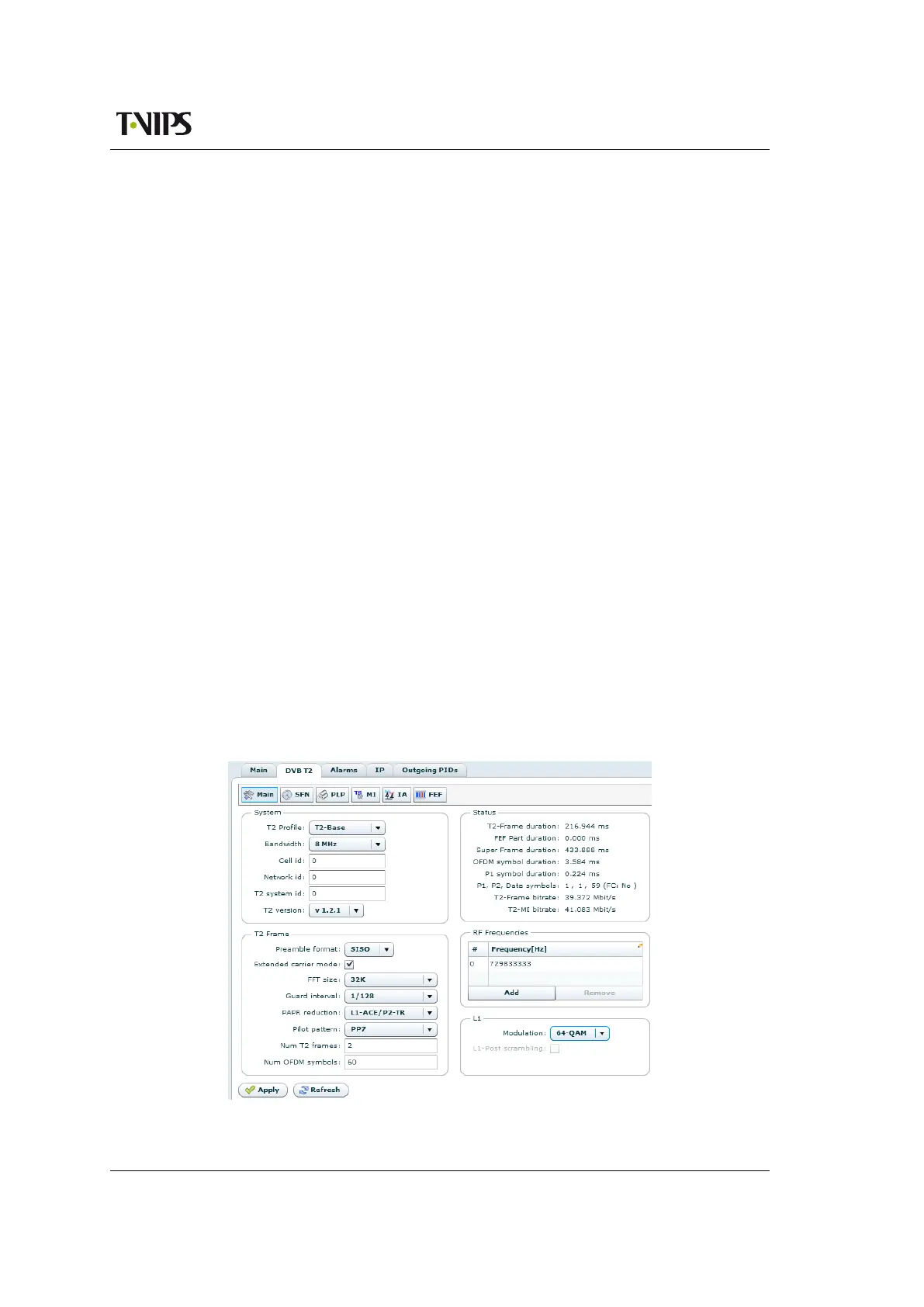 This page displays information about the DVB-T2 signal and includes the main settings for the