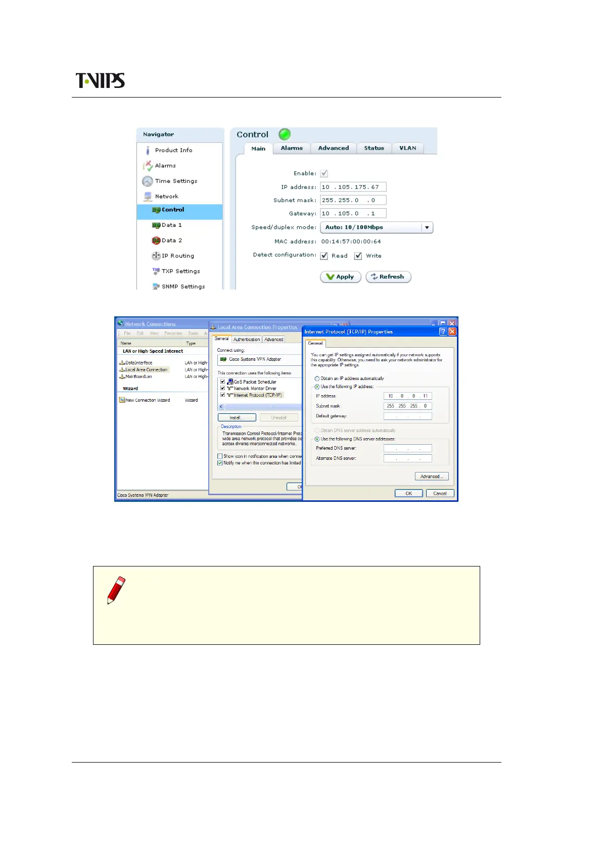 Figure 7.2 Setting static IP address 10.0.0.11 in Windows XP