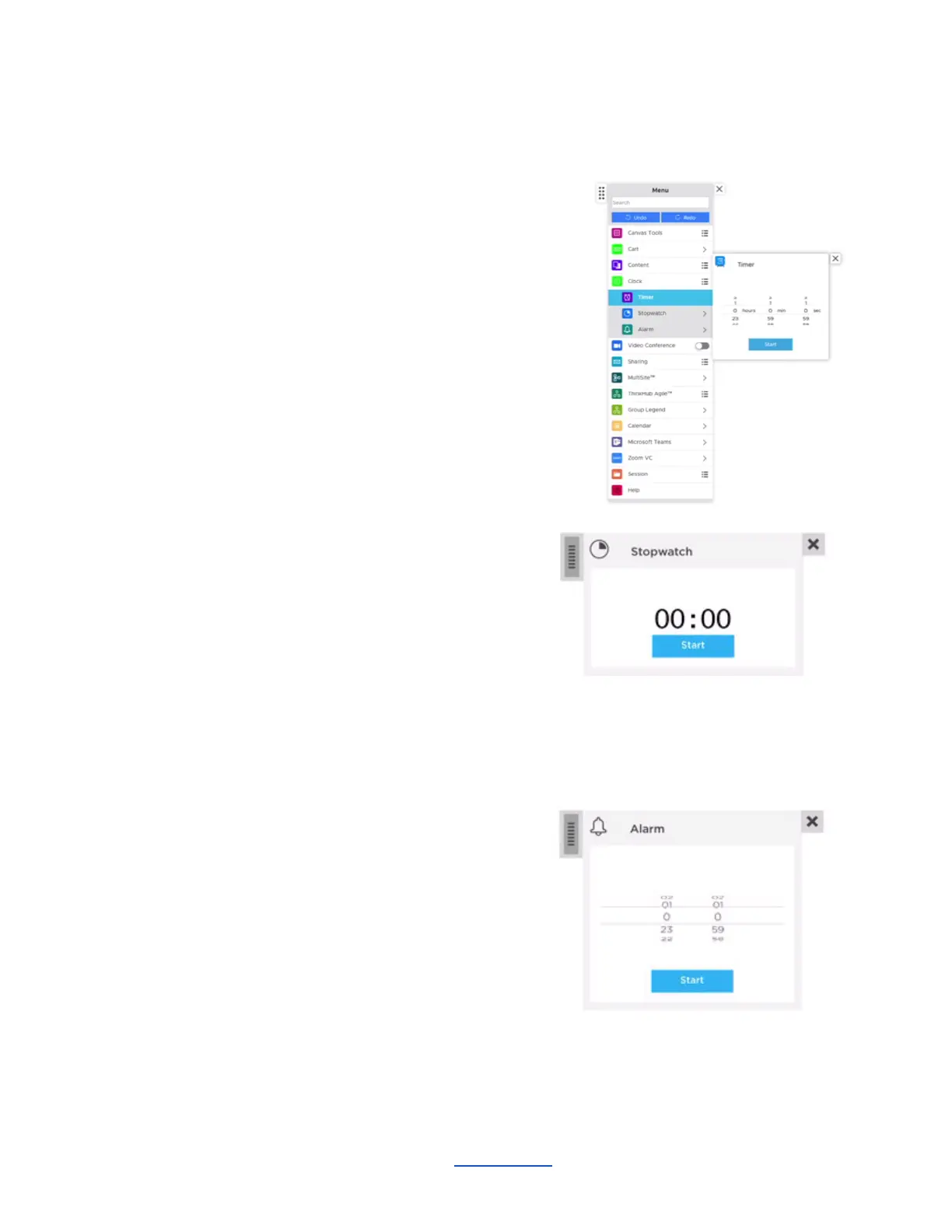 The ThinkHub Clock features three main capabilities: Timer, Alarm, and Countdown. Use these applications to
