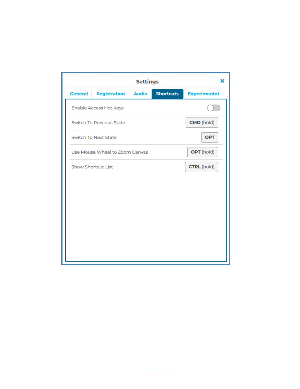 T1V ThinkHub - Settings - Shortcuts; Enable Access Hot Keys; Switch States Shortcut; Zoom Canvas Shortcut