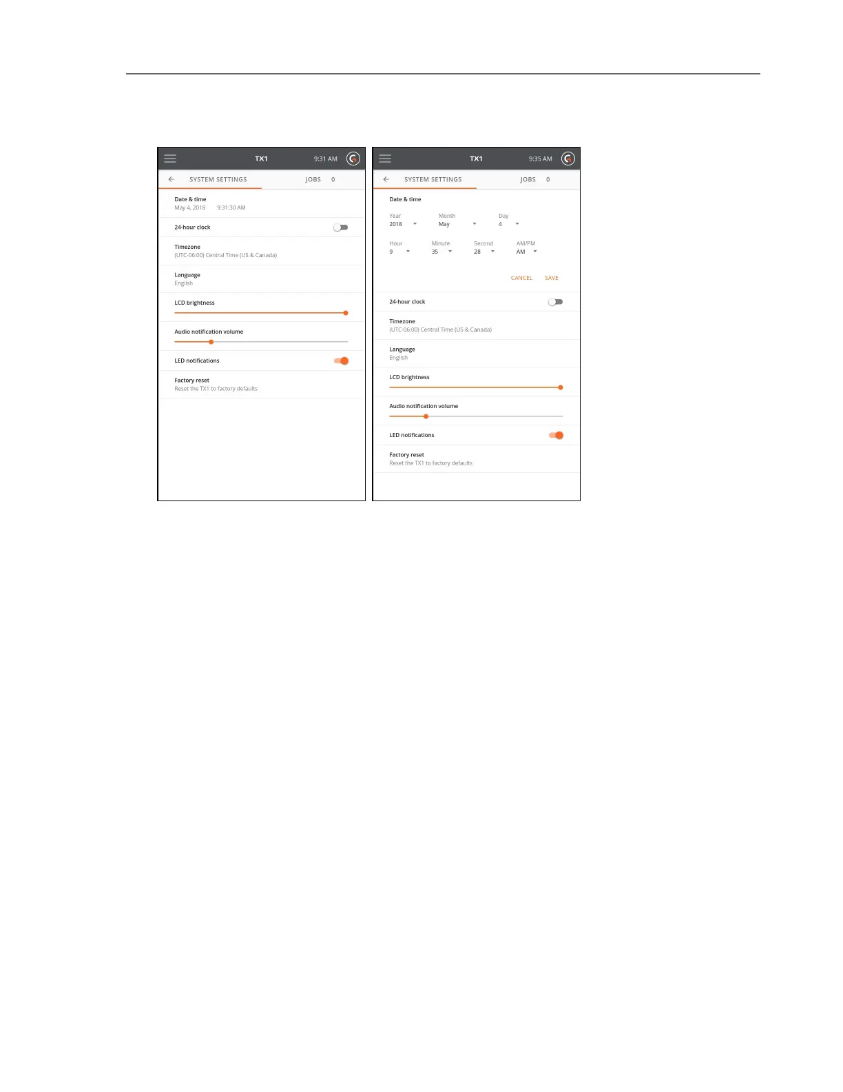 Date & time, 24-hour clock, Timezone, Language, LCD brightness, Audio notification