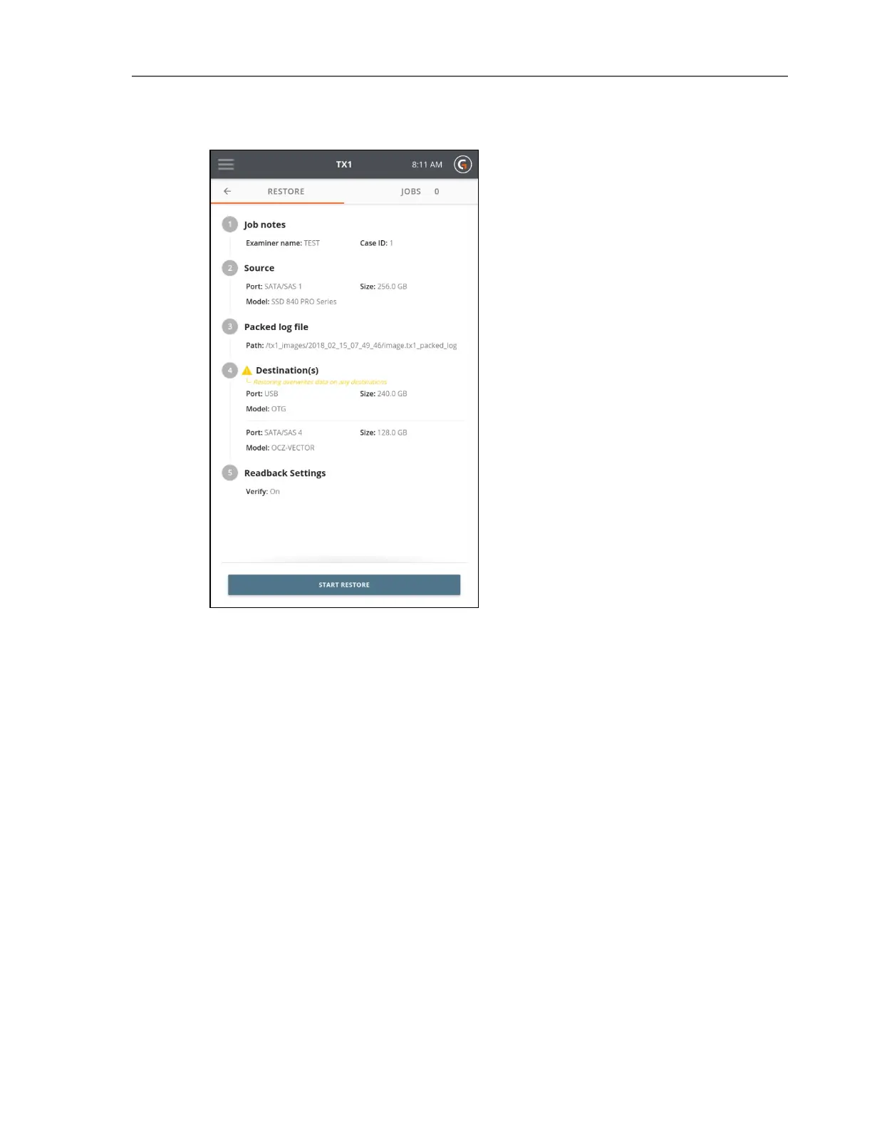 6. Tap the Start Restore button at the bottom of the screen. A job status modal displays.