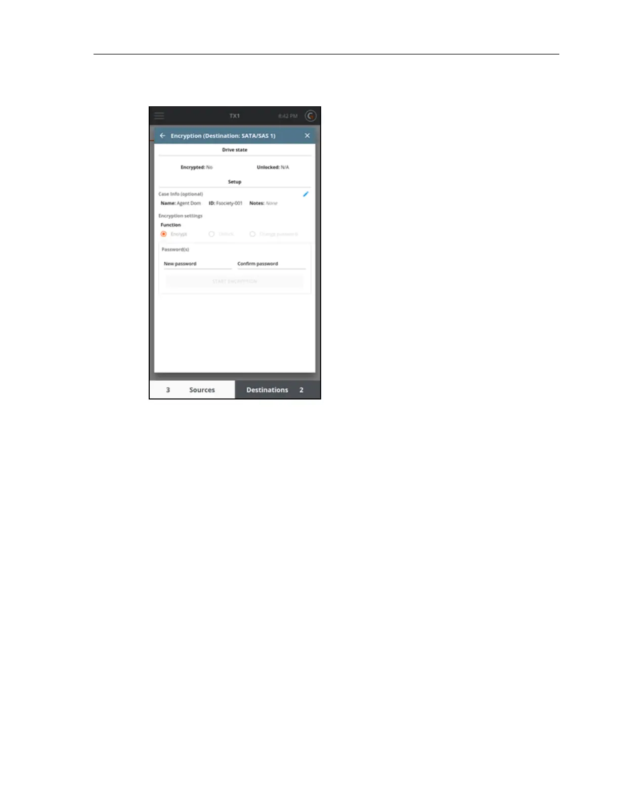 To remove encryption from a drive, connect the drive to the TX1 as a destination or accessory