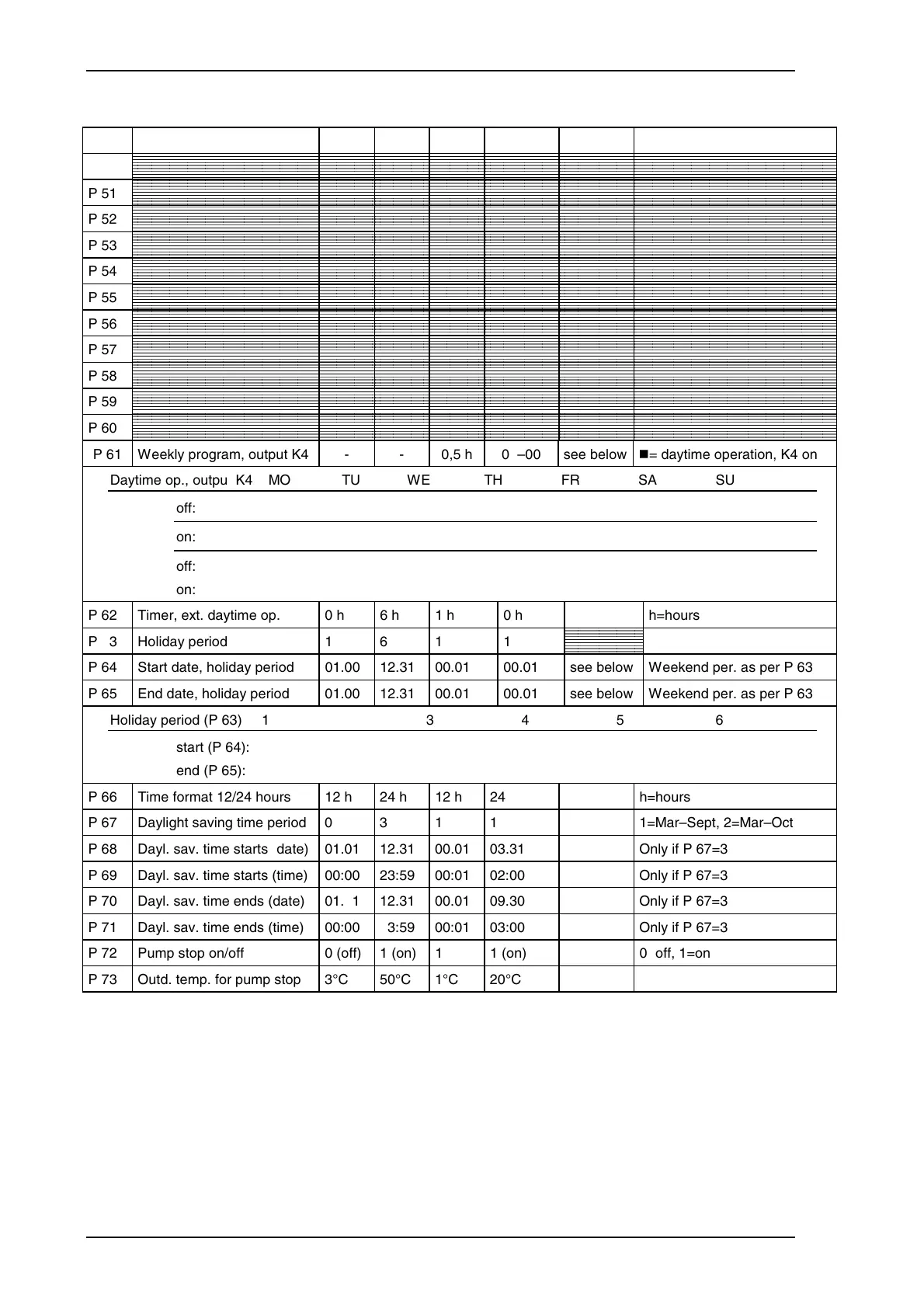 P 61 Weekly program, output K4 - - 0,5 h 00–00 see below != daytime operation, K4 on