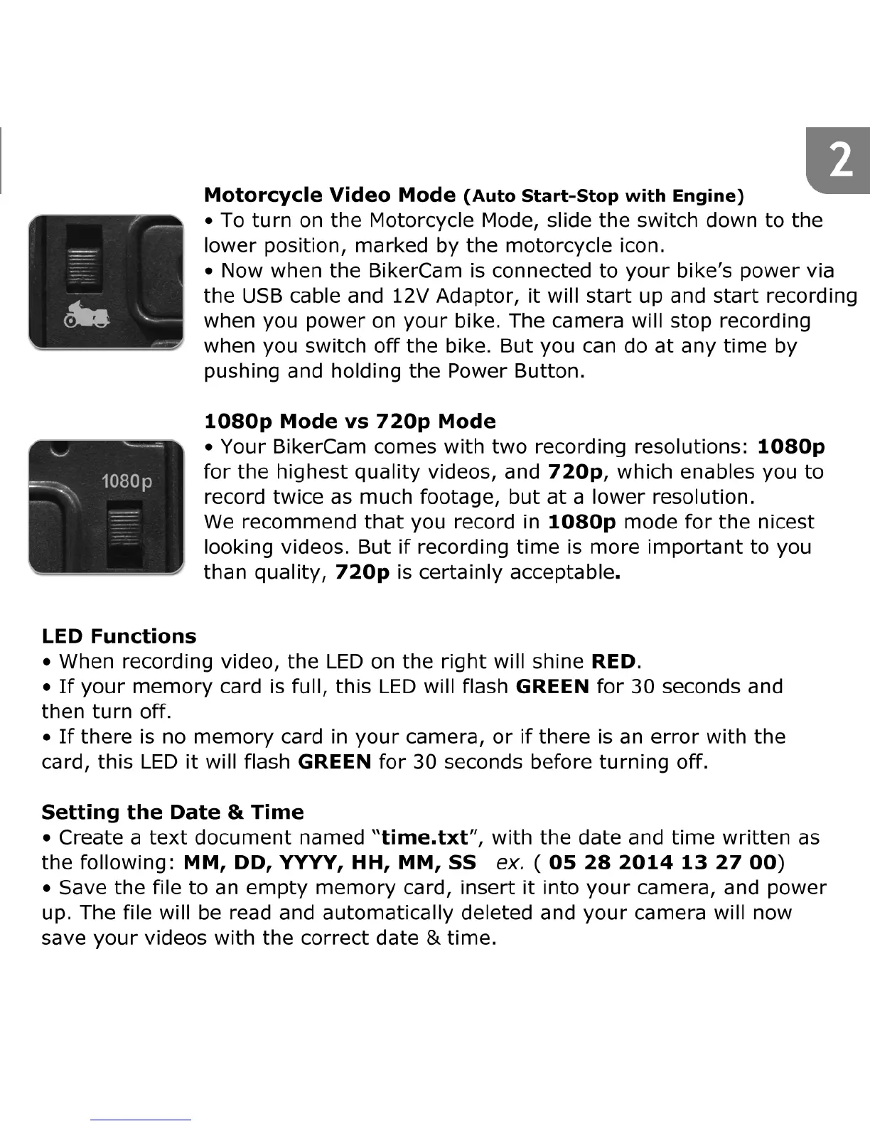Tachyon BikerCam - Motorcycle Video Mode; Engaging Motorcycle Mode; Video Resolution Options; 1080 p vs 720 p