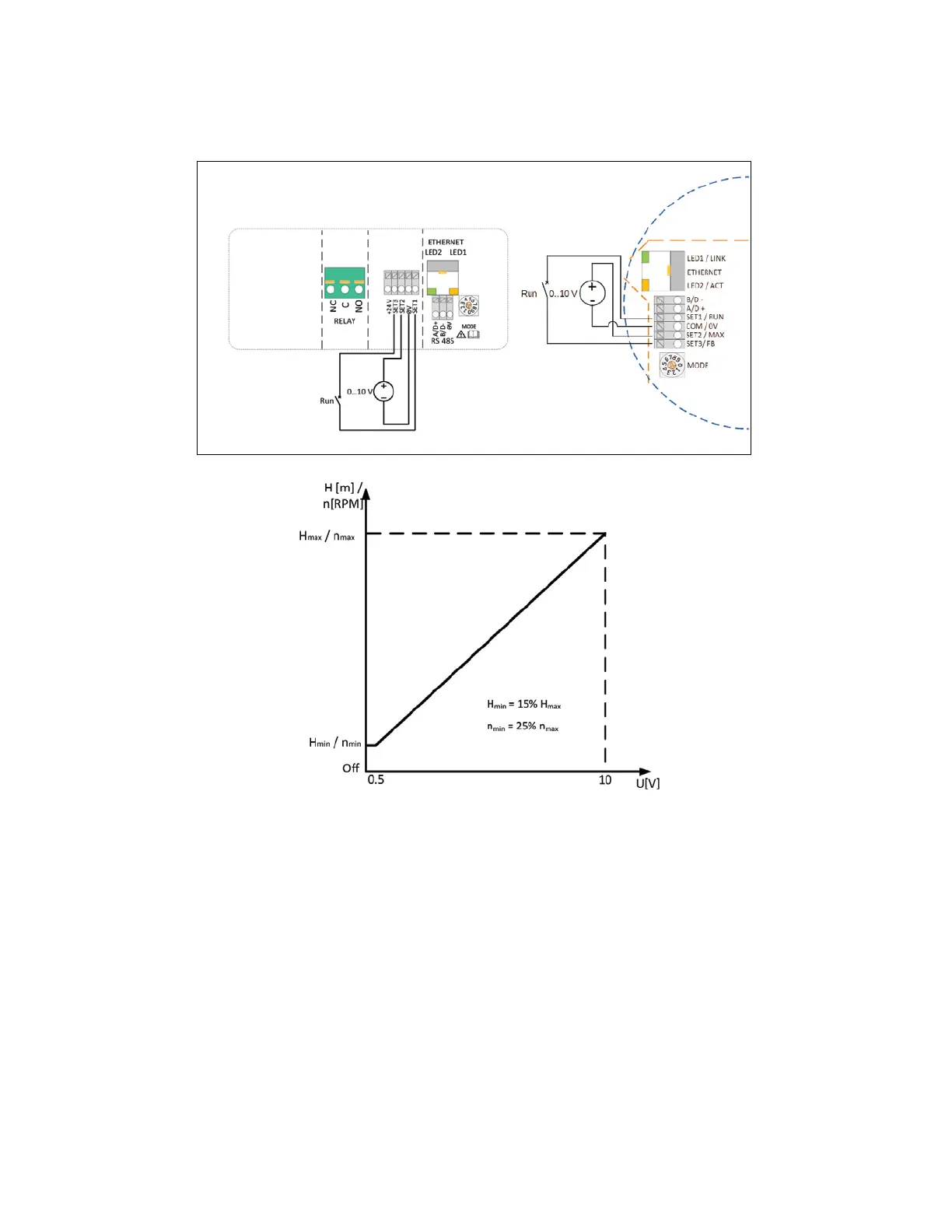 - 0 to 0.5 V pump runs at min speed (25% of max speed) or min head (15% of max head)