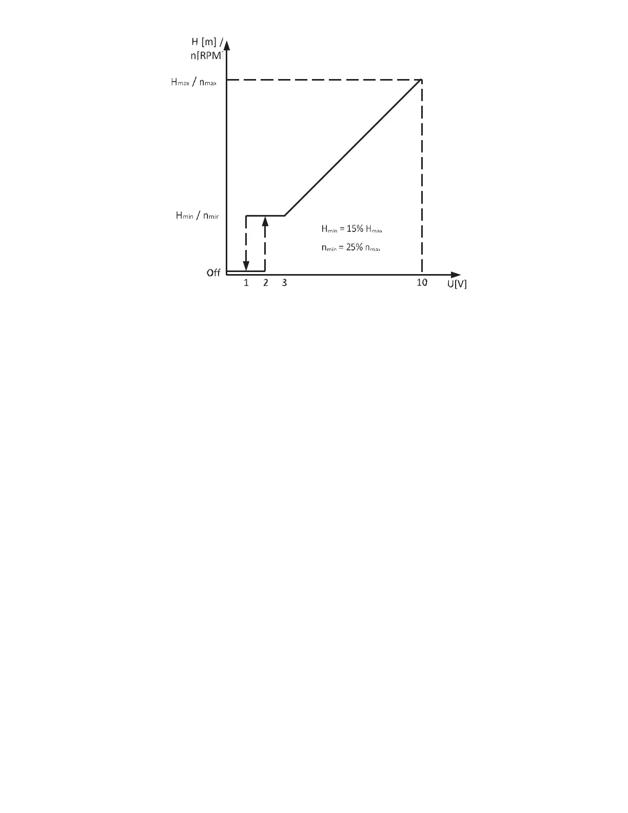 - 2 to 3 V pump runs at min speed (25% of max speed) or min head (15% of max head)