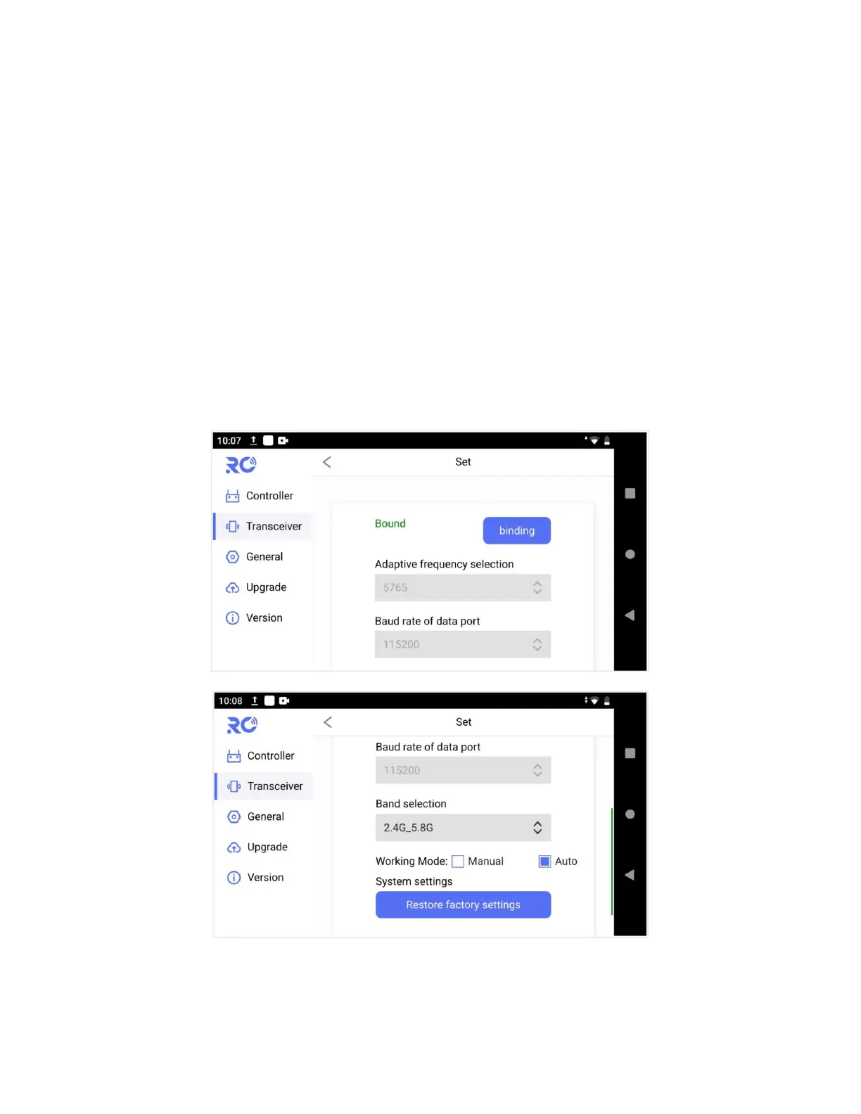 At Set page, user can do binding operation, working frequency mode change, and restore factory