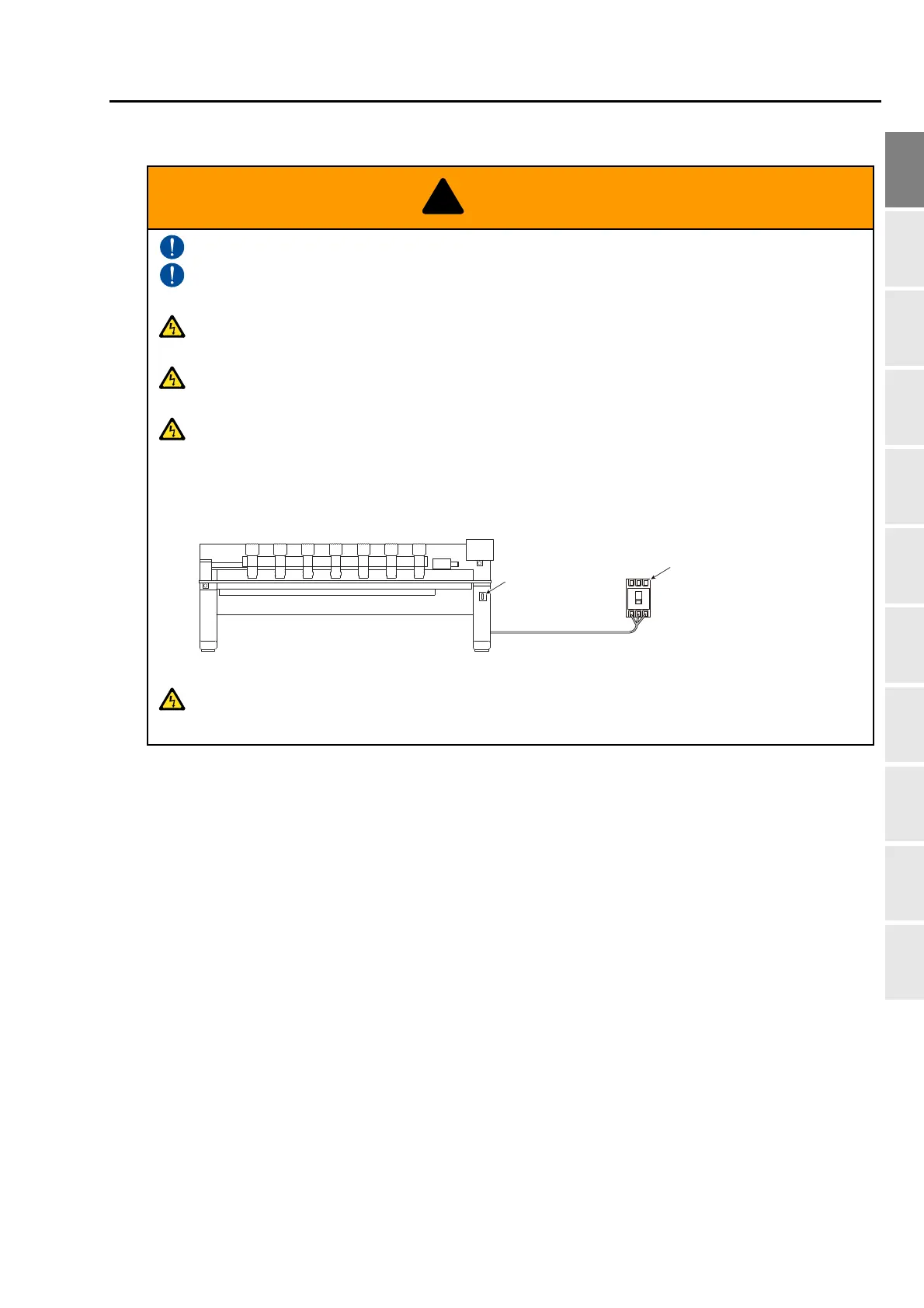 Before opening the electrical boxes, be sure to turn OFF the power switch of the machine and shut