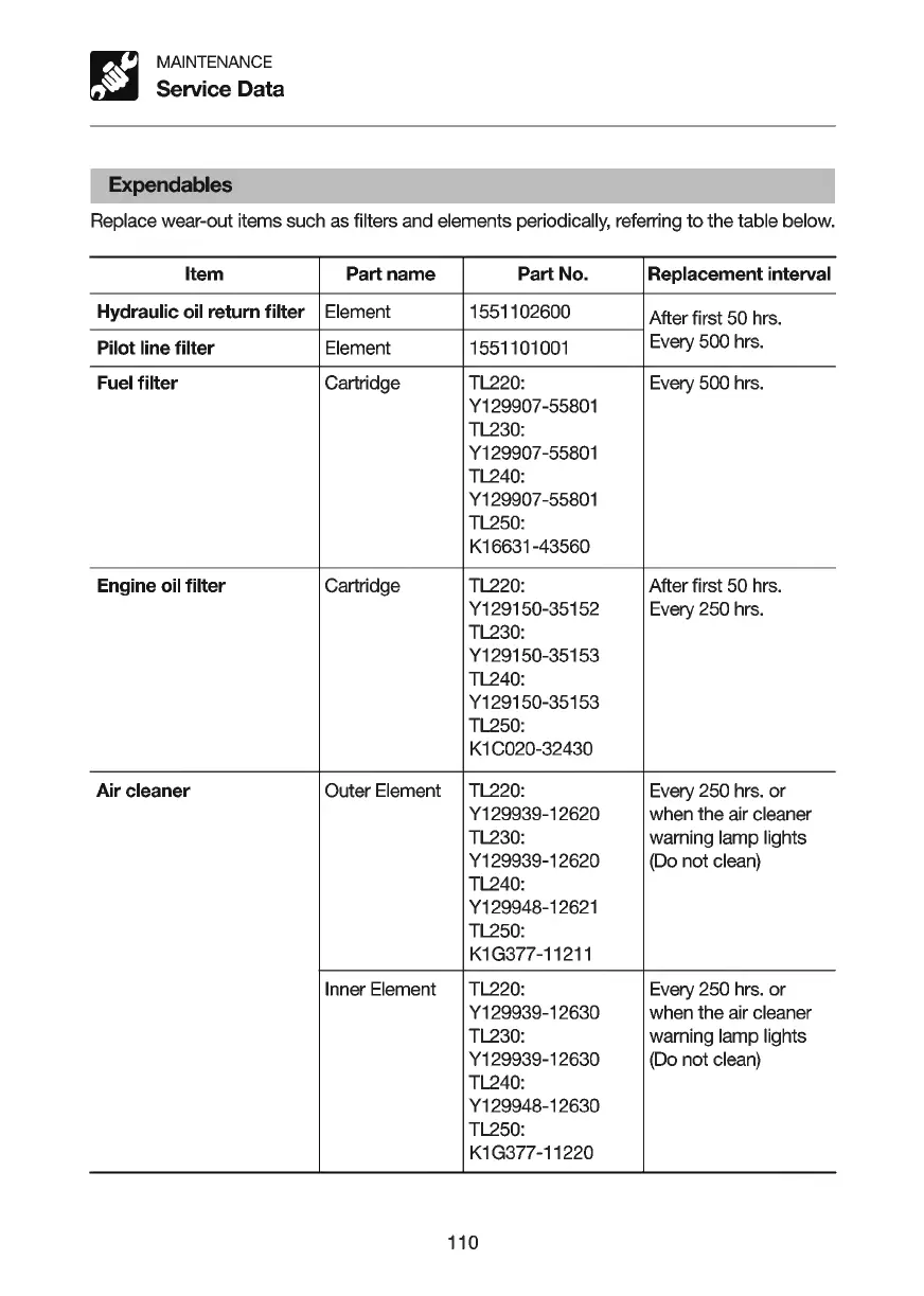 Air cleaner Outer Element TL220: Every 250 hrs.