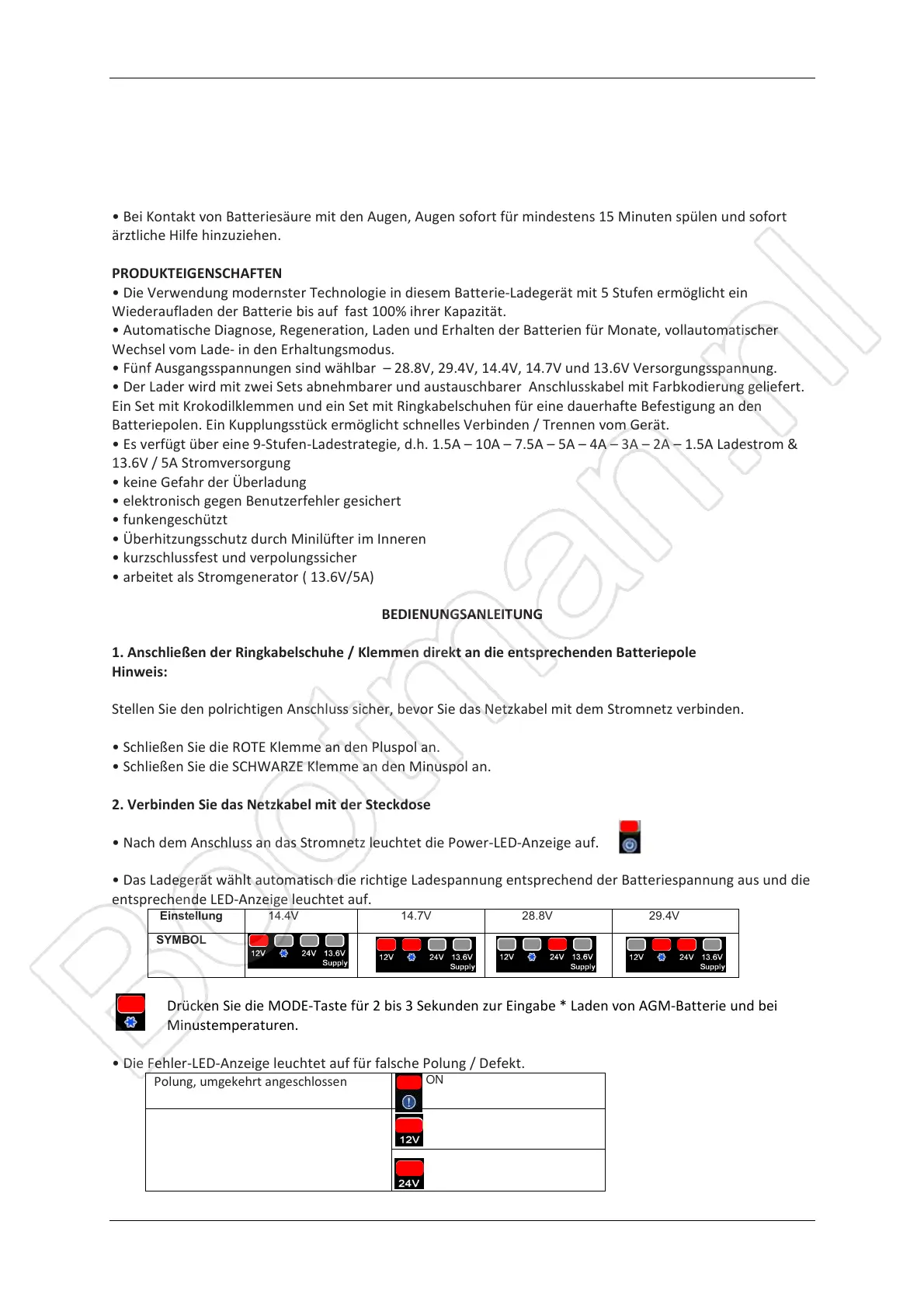• Die Fehler-LED-Anzeige leuchtet auf für falsche Polung / Defekt.