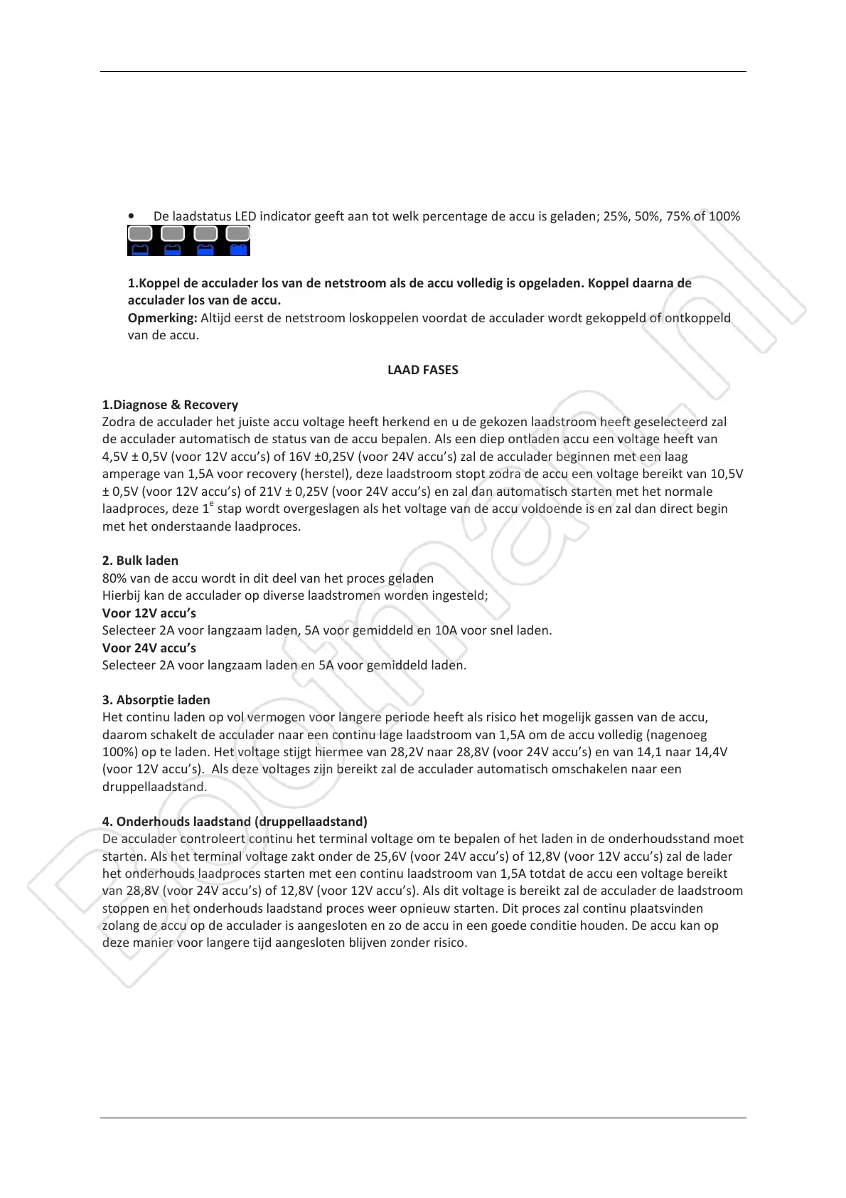 4,5V ± 0,5V (voor 12V accu’s) of 16V ±0,25V (voor 24V accu’s) zal de acculader beginnen met een laag