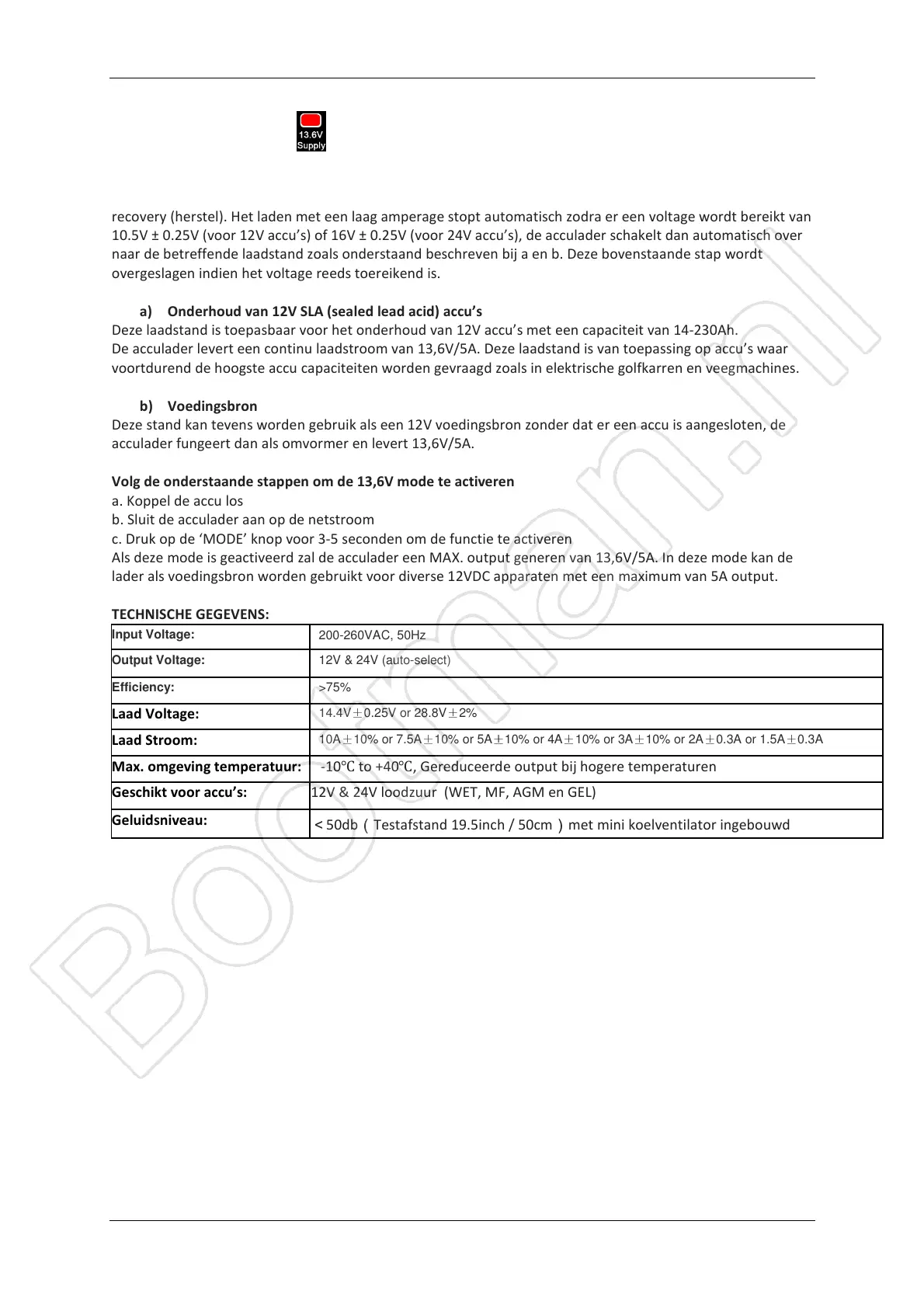 De acculader levert een continu laadstroom van 13,6V/5A. Deze laadstand is van toepassing op accu’s waar