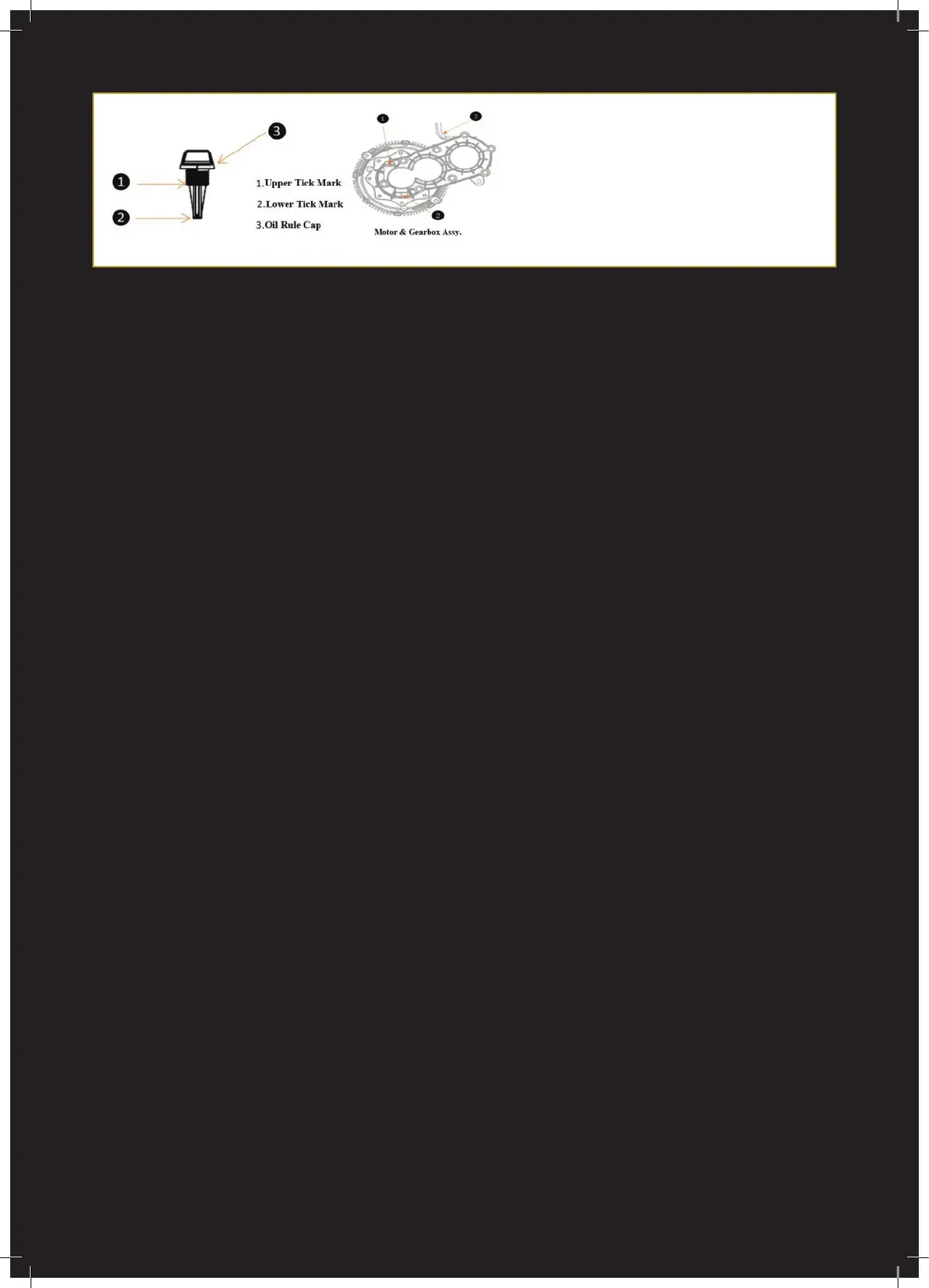 and lower tick marks. Please do not ride electric motorcycle if the gearbox is short of or without lubricating oil as