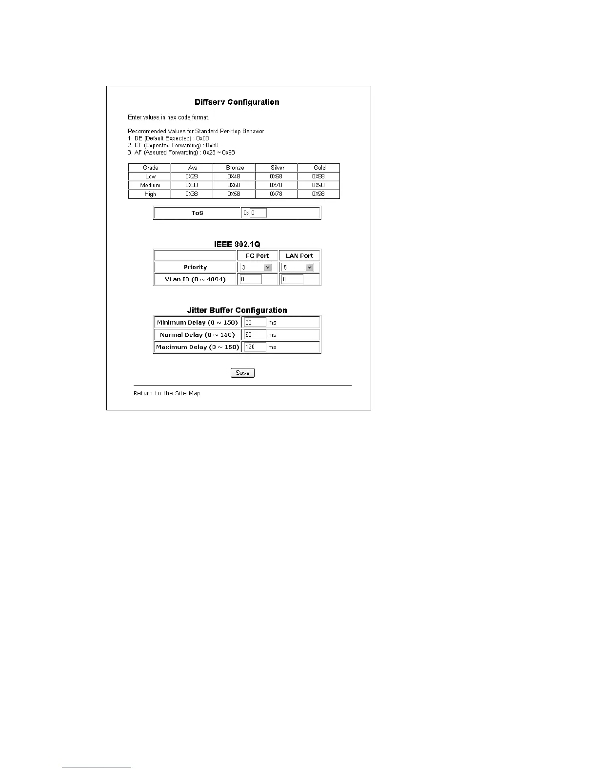 DiffServ Code Point (DSCP) or ToS establishes the priority of voice packets. Compatible routers apply the