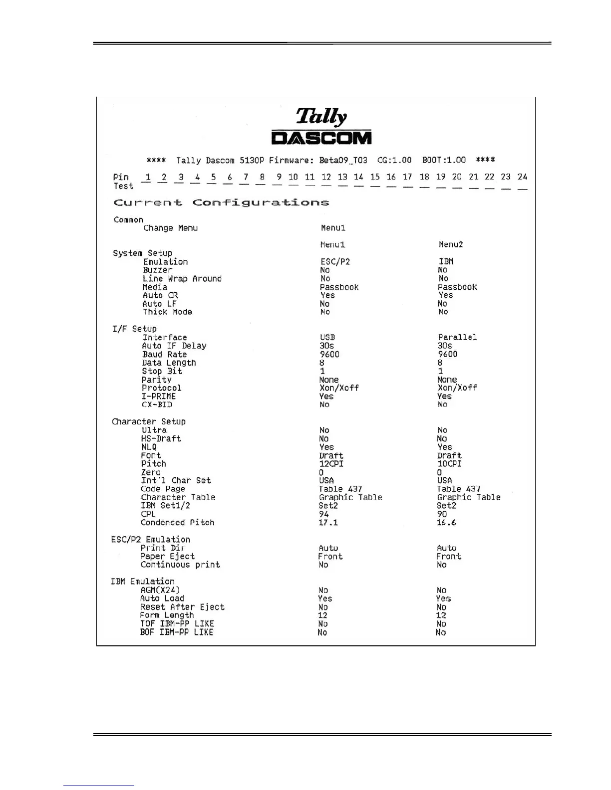 Tally Dascom 5130P - Menu Configuration (Sample )
