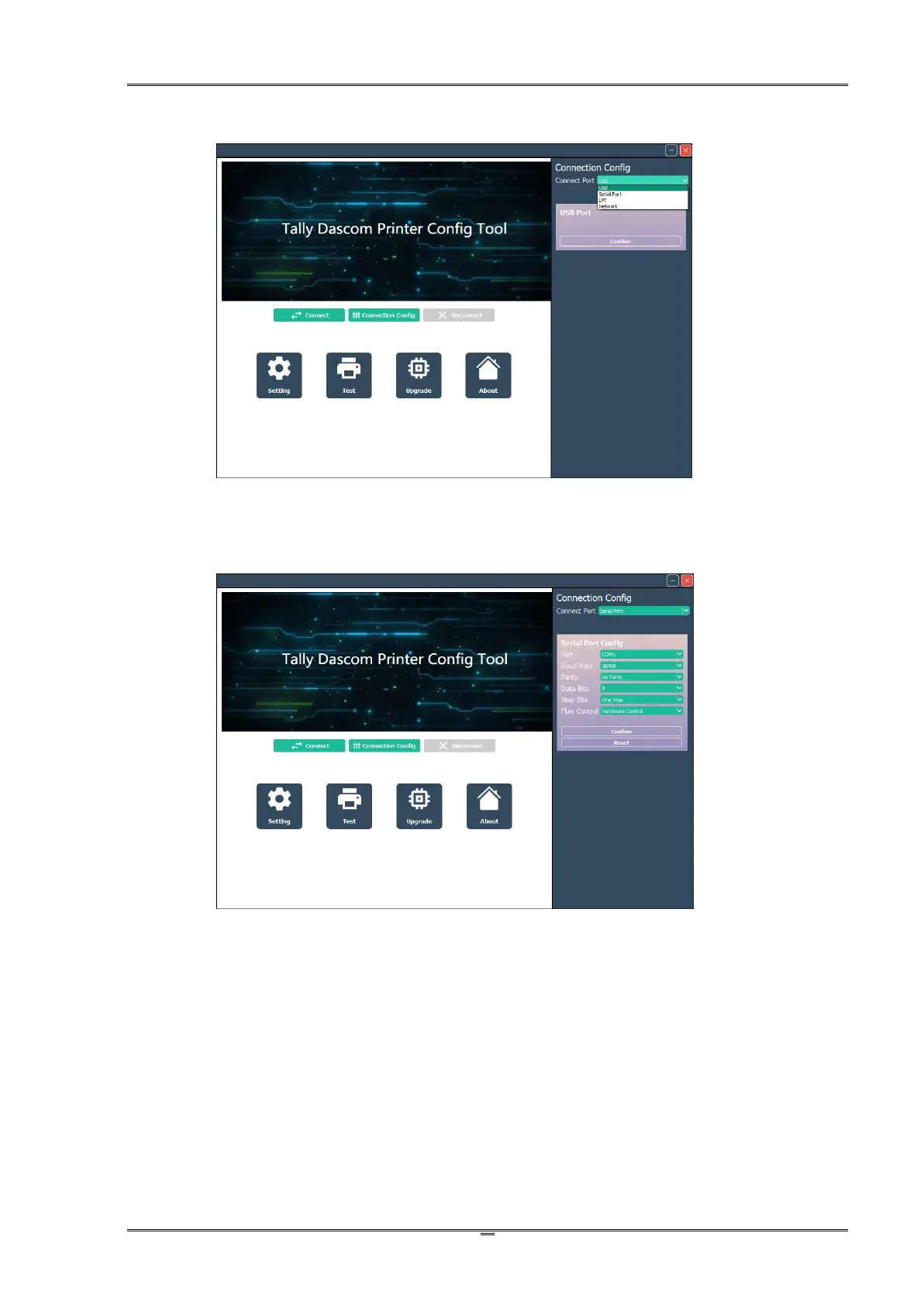 2Use Connection Config to select the I/O being used to connect to the Printer, USB, Serial,