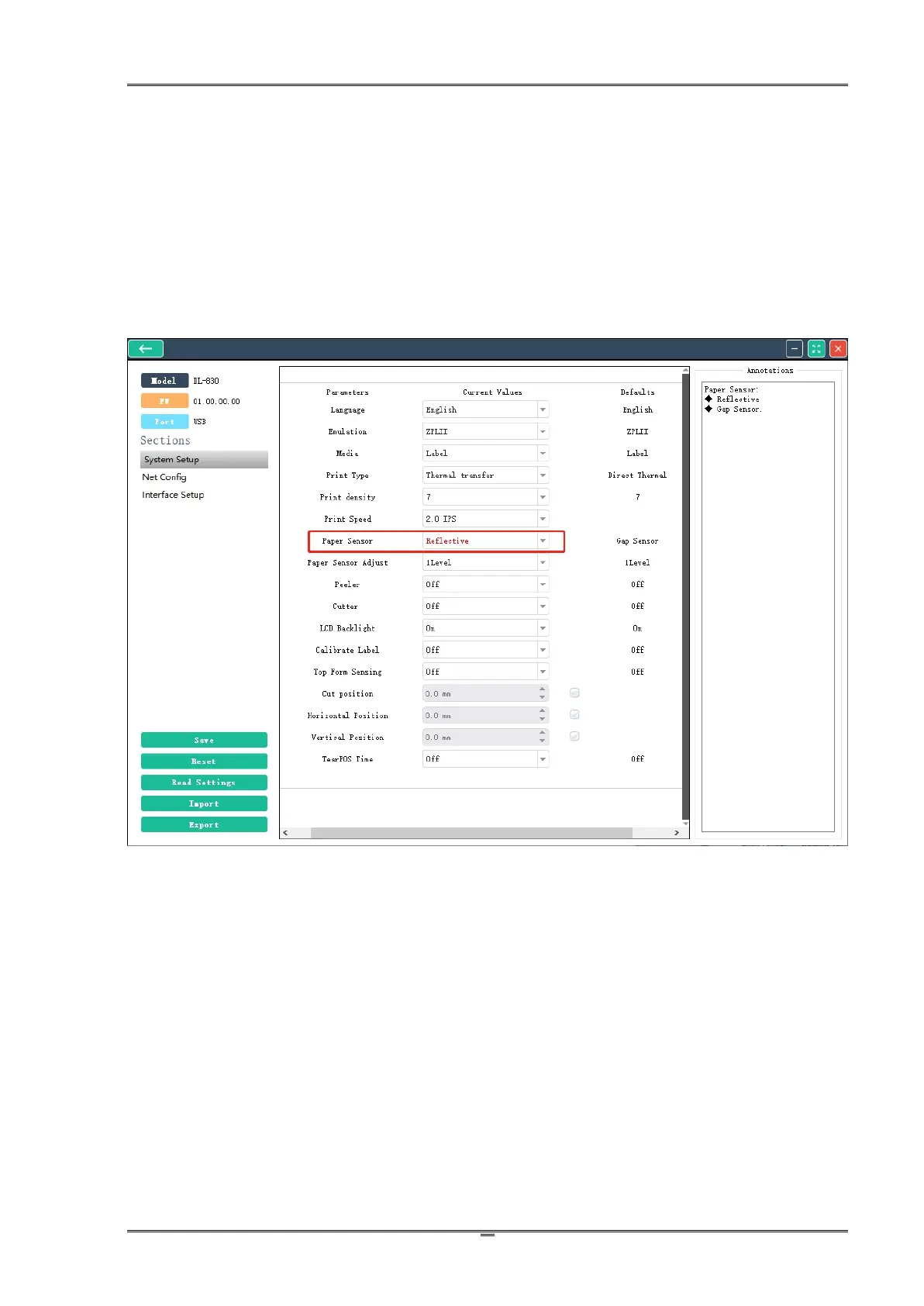 In Config Tool, click Connect; then click Setting. Select Reflective for Paper Sensor to support