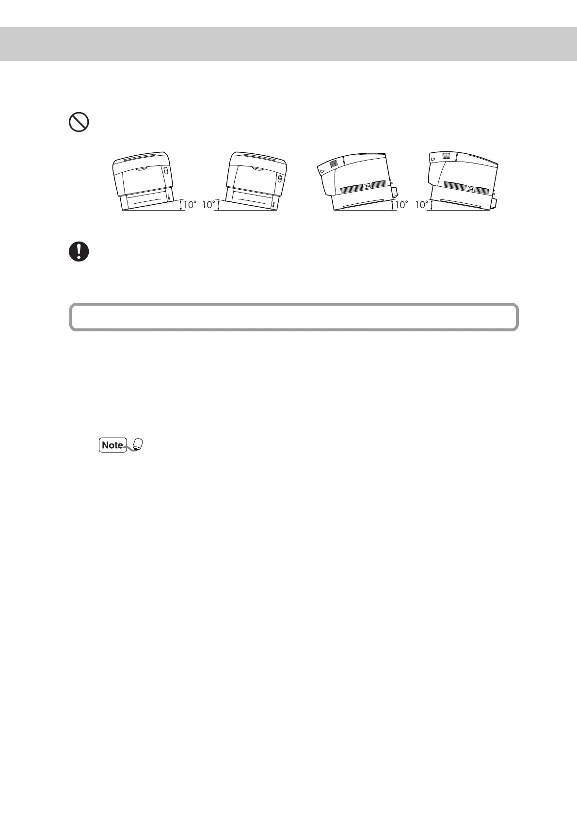 When moving the printer, do not tilt it more than 10 degrees. If tilted excessively,