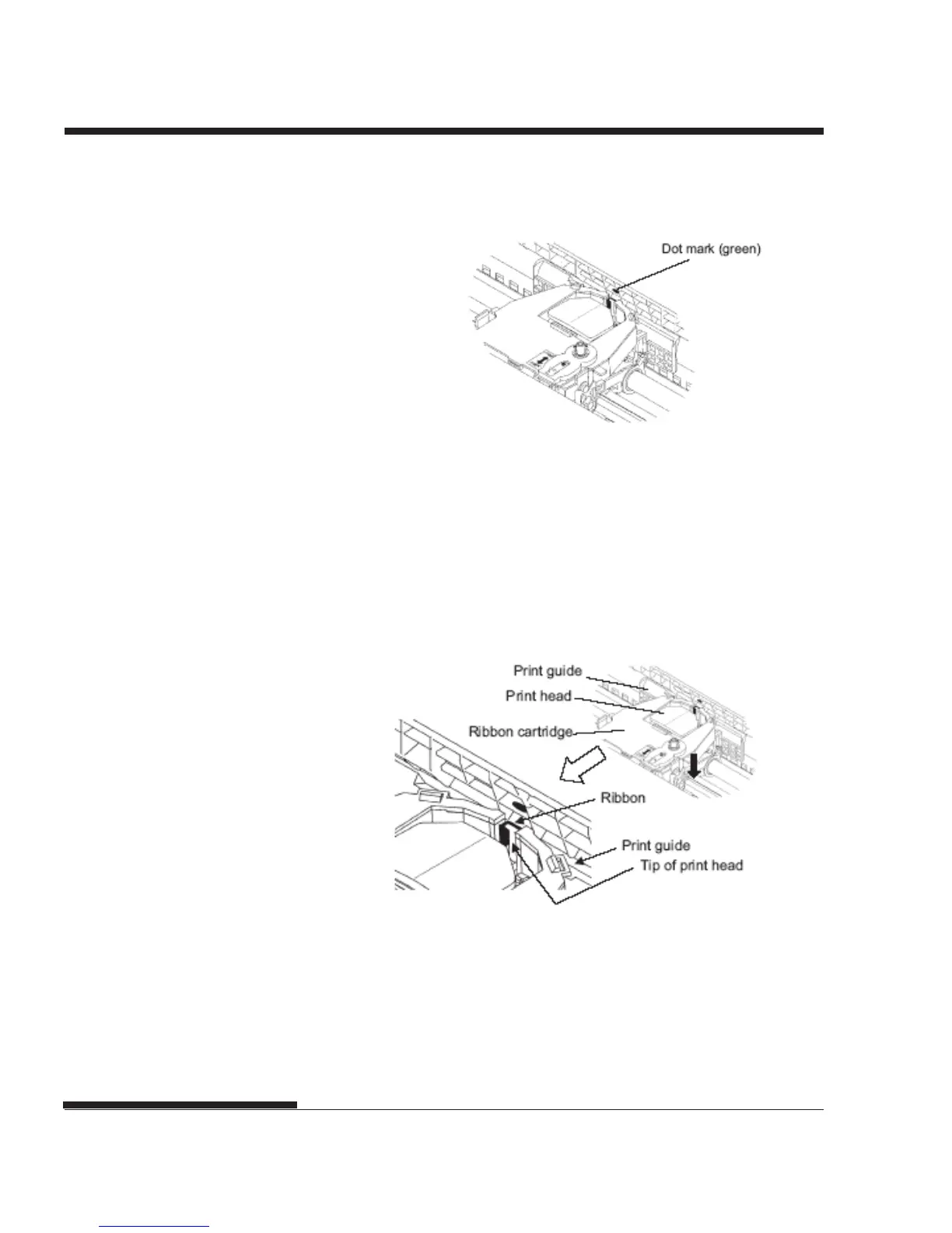 10. Thread the ribbon between the print head and the print guide, then