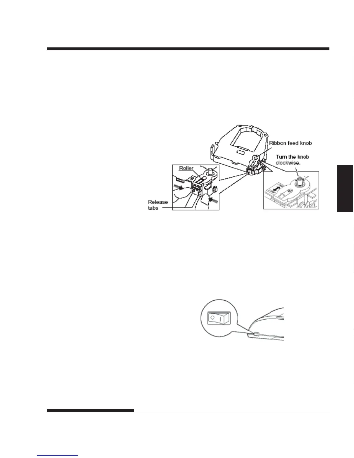 and turn the ribbon feed knob clockwise to take up any ribbon slack.